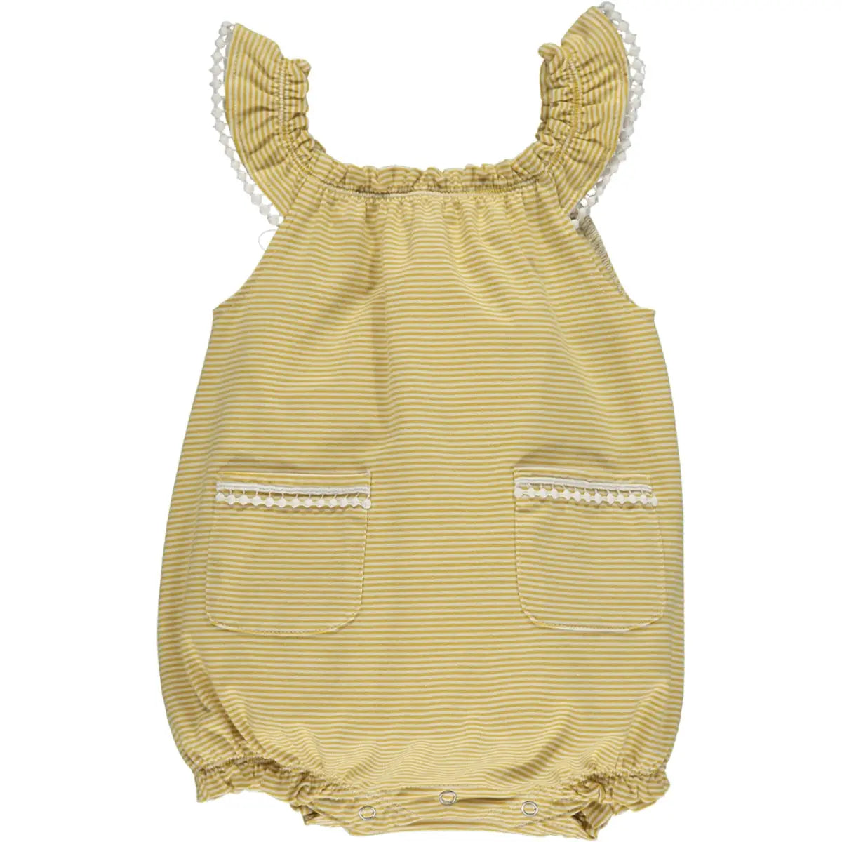 With its soft, striped jersey material, flutter sleeves, and button bottom, our Cali Romper is the perfect summer style for your on-the-go little one.