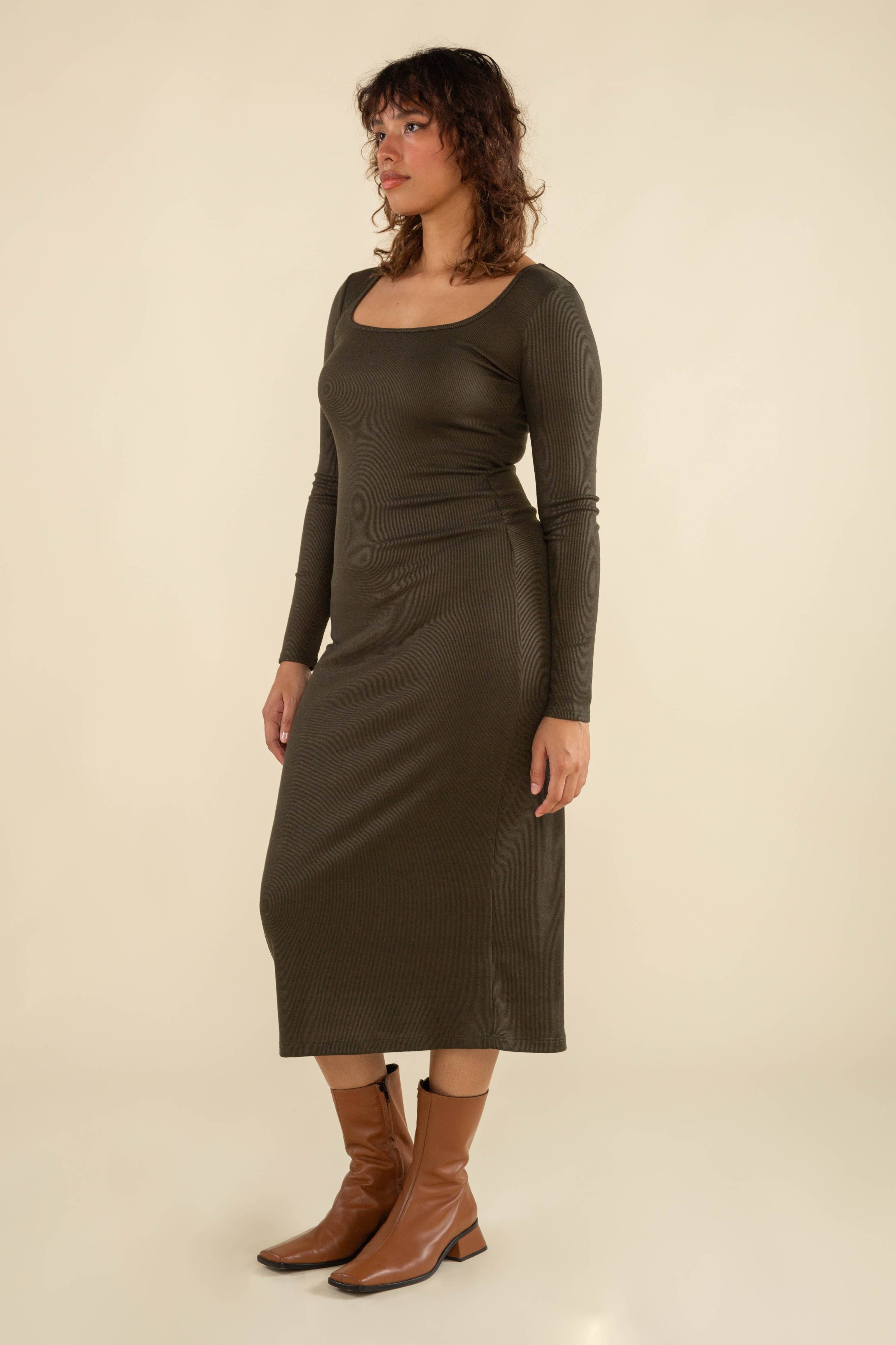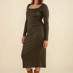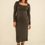This square neck long sleeve rib knit midi dress features a deep square neck and bodycon silhouette.