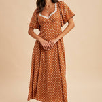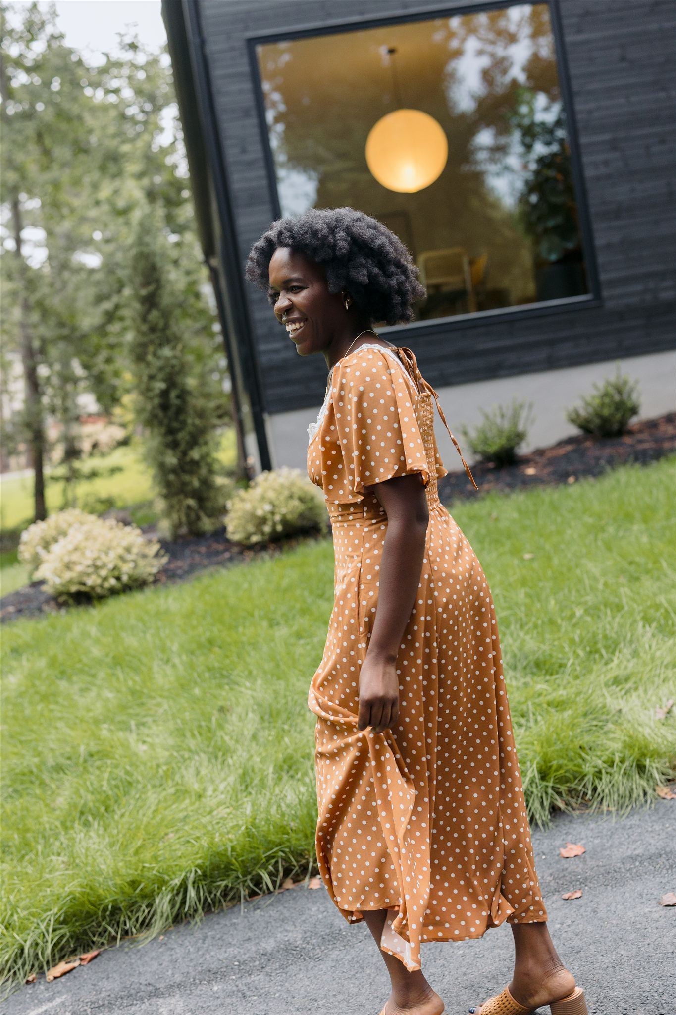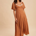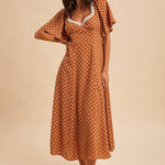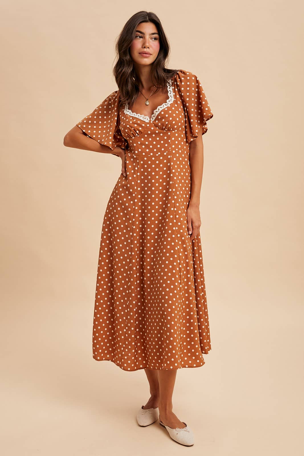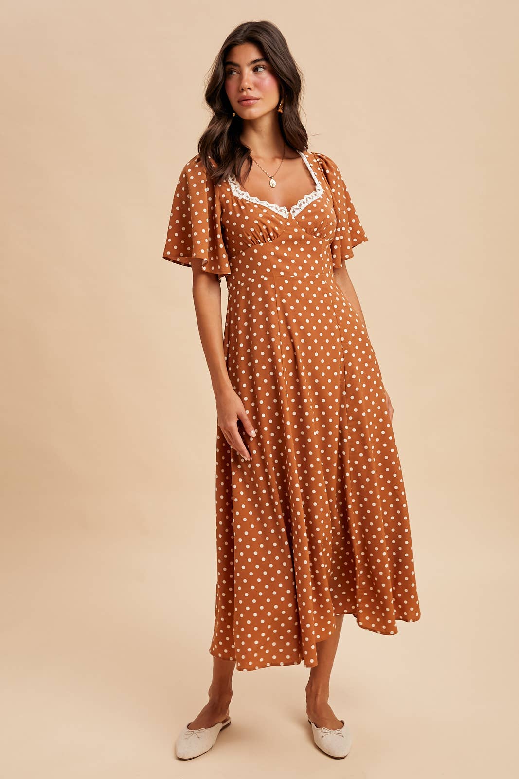 This vintage-inspired midi dress features a sweetheart neckline with delicate lace trim, flutter sleeves, and, of course, pockets.