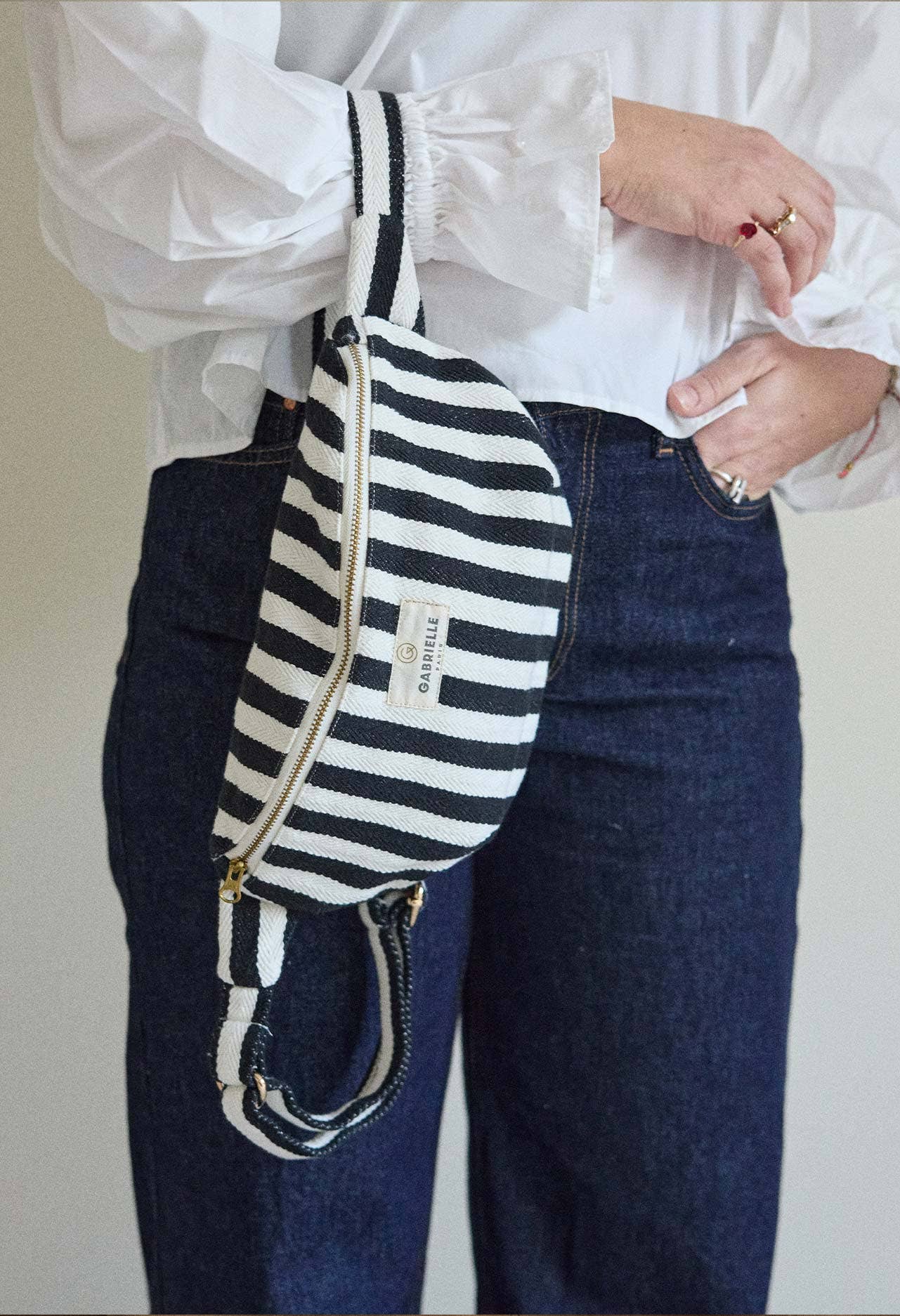 Elegant and easy to wear, the black striped fanny pack is the chic and practical everyday accessory. With its simple and graphic design, it adapts to all styles and accompanies your days with discretion and efficiency. Its cream lining, interior pocket, and adjustable strap make it as functional as it is refined.