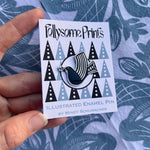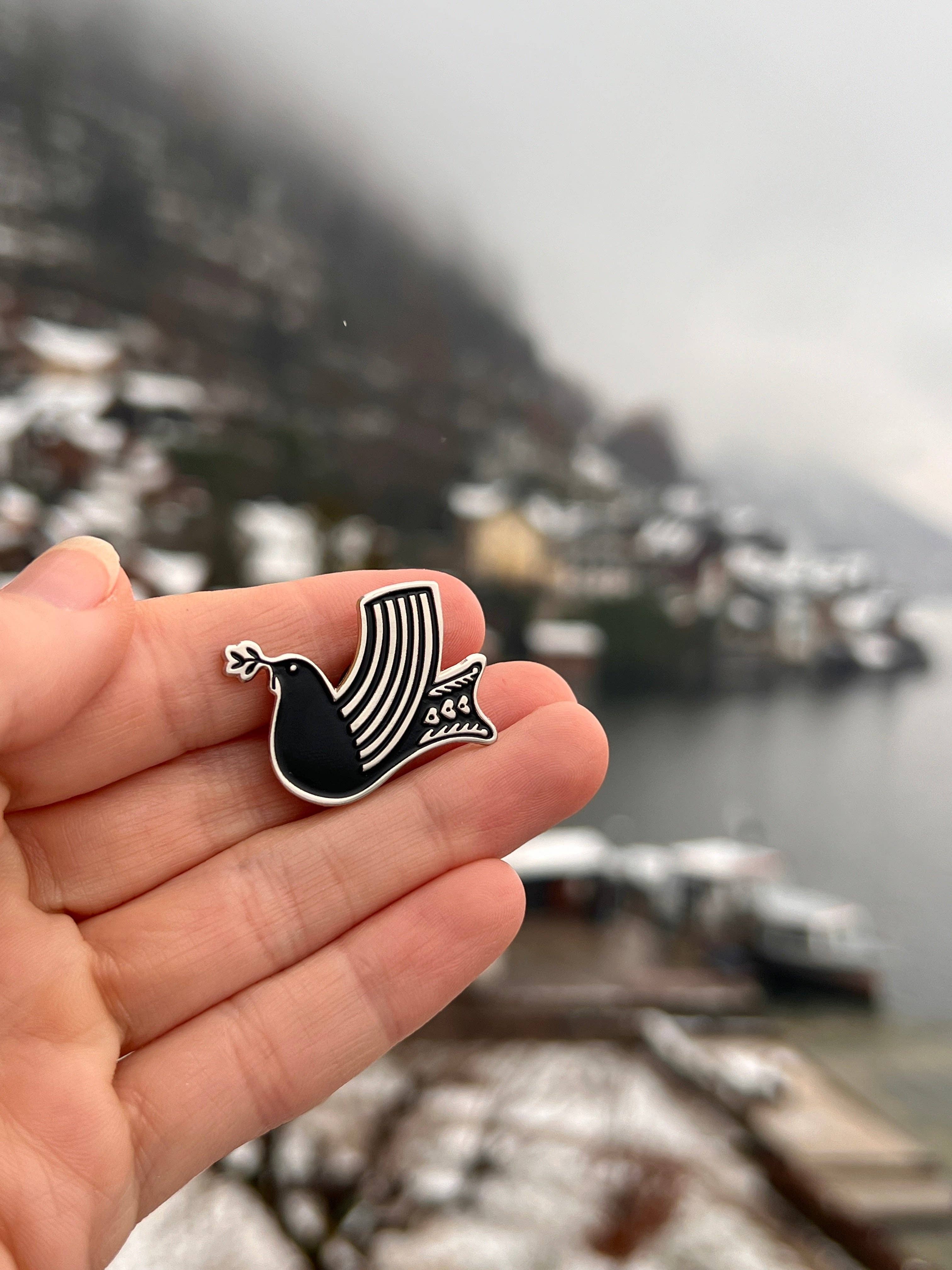 Original illustration forged into a glimmering lapel pin. Celebrating folk art traditions and family heritage, featured on a carefully designed pinback card. In honor of our Scandinavian ancestry and in the spirit of sharing peace.