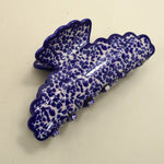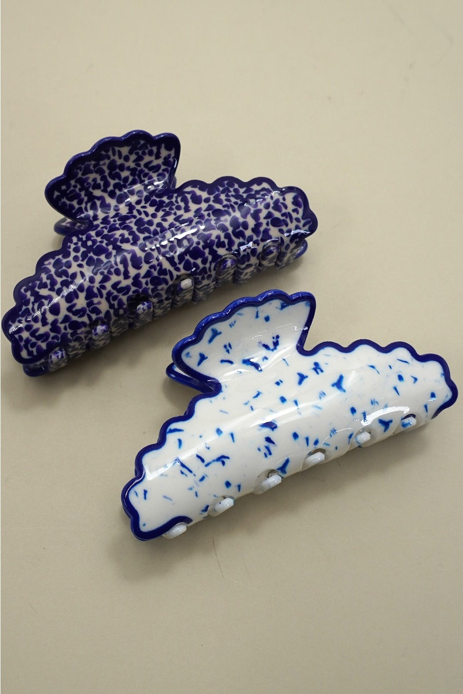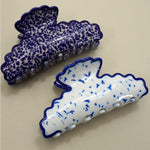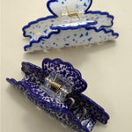 This half moon claw clip features scalloped edges and a porcelain-inspired vintage design.