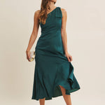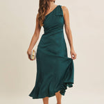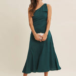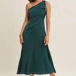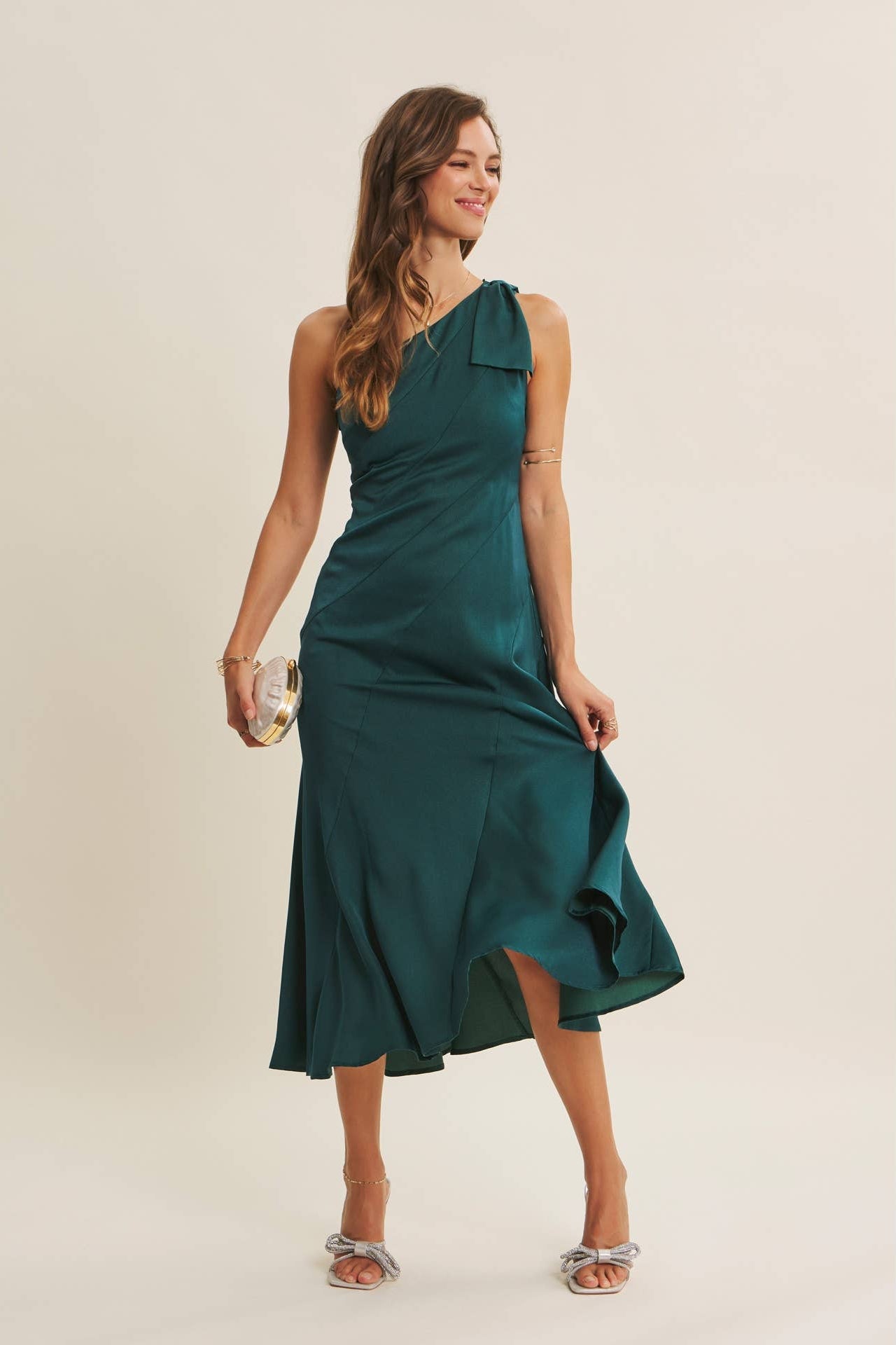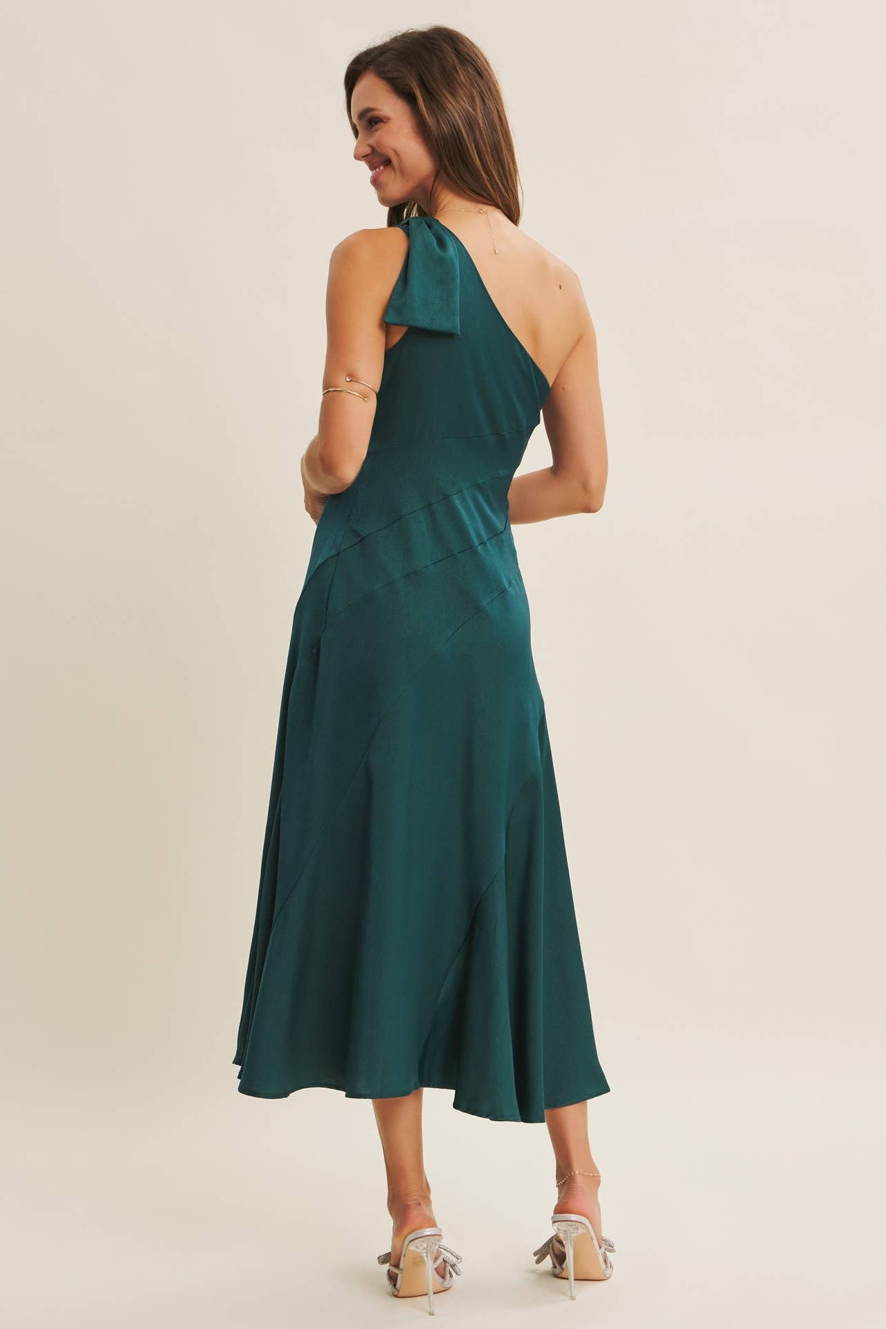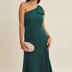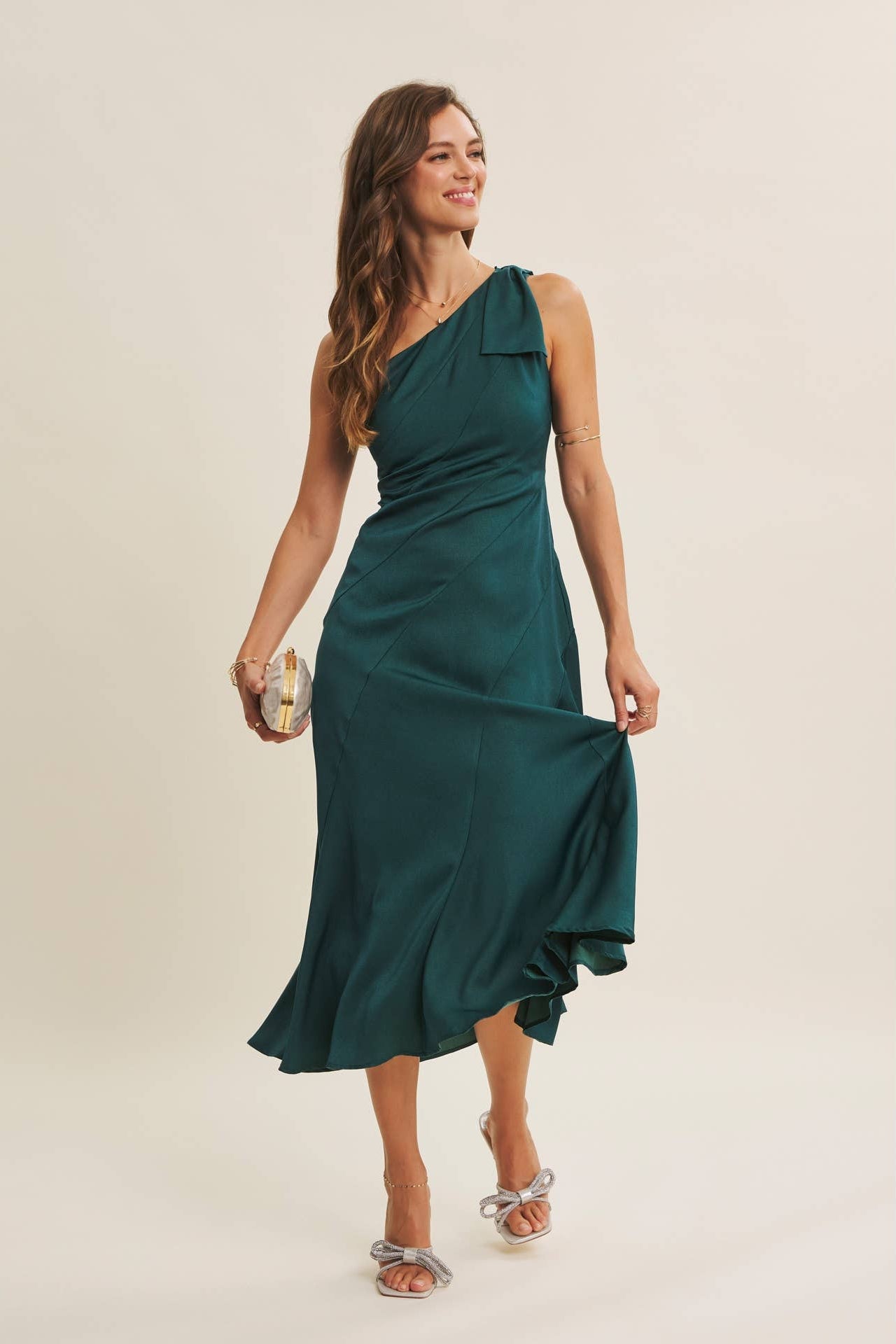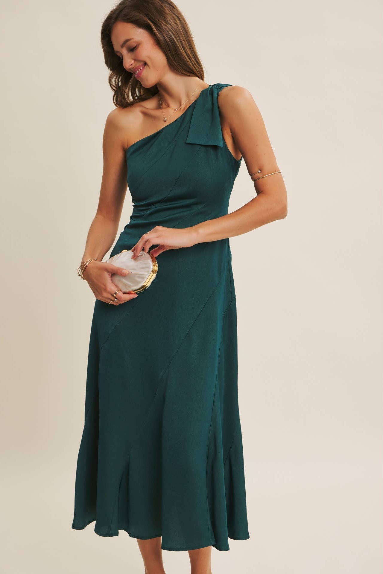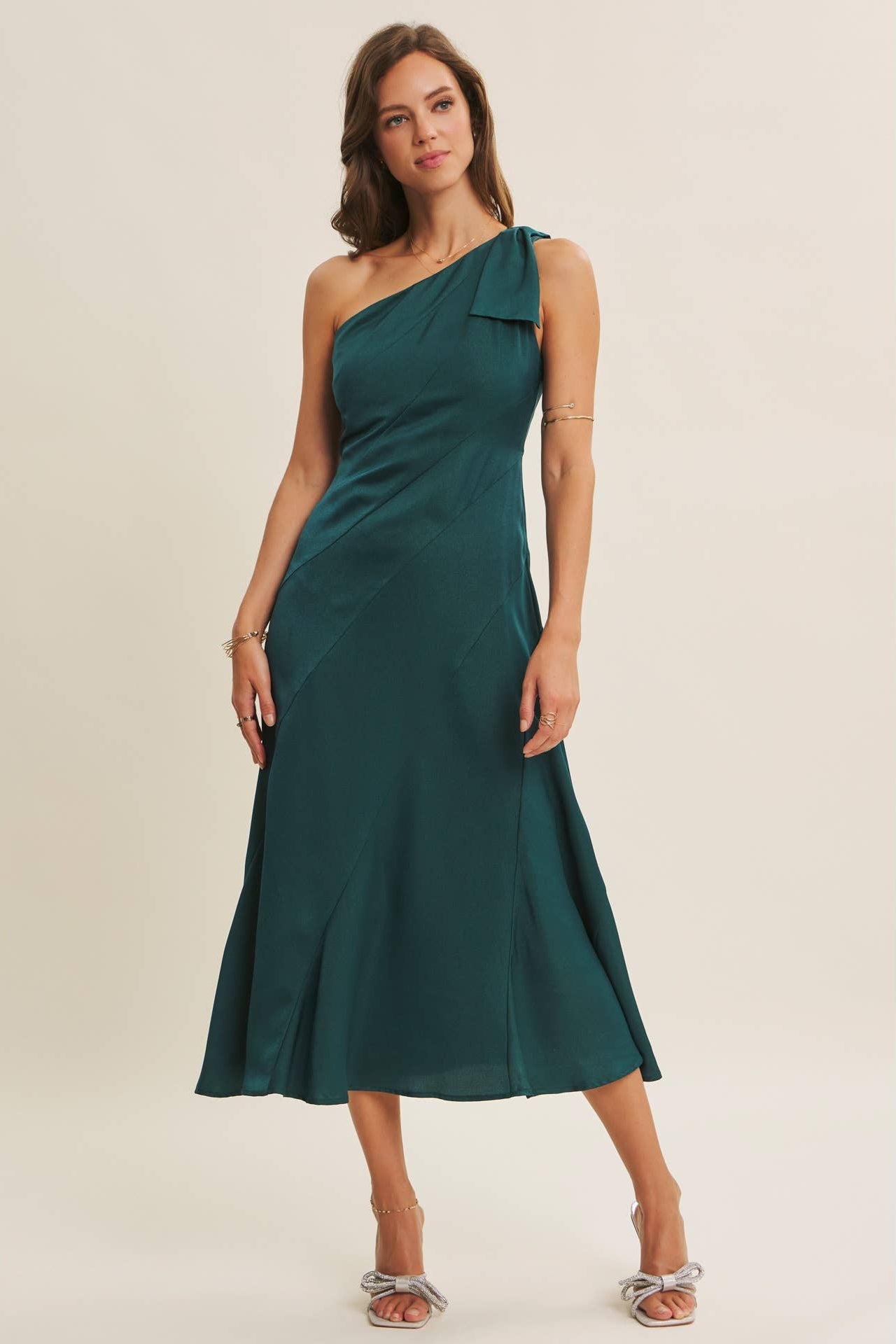 Shimmer with sophistication in this one-shoulder bow detail midi dress, designed for unforgettable evenings and special celebrations. The slanted seamwork flatters and elongates your figure, while the flared hem offers graceful movement with every step. A delicate bow at the shoulder adds a feminine, romantic finish that balances the sleek silhouette.