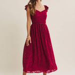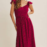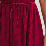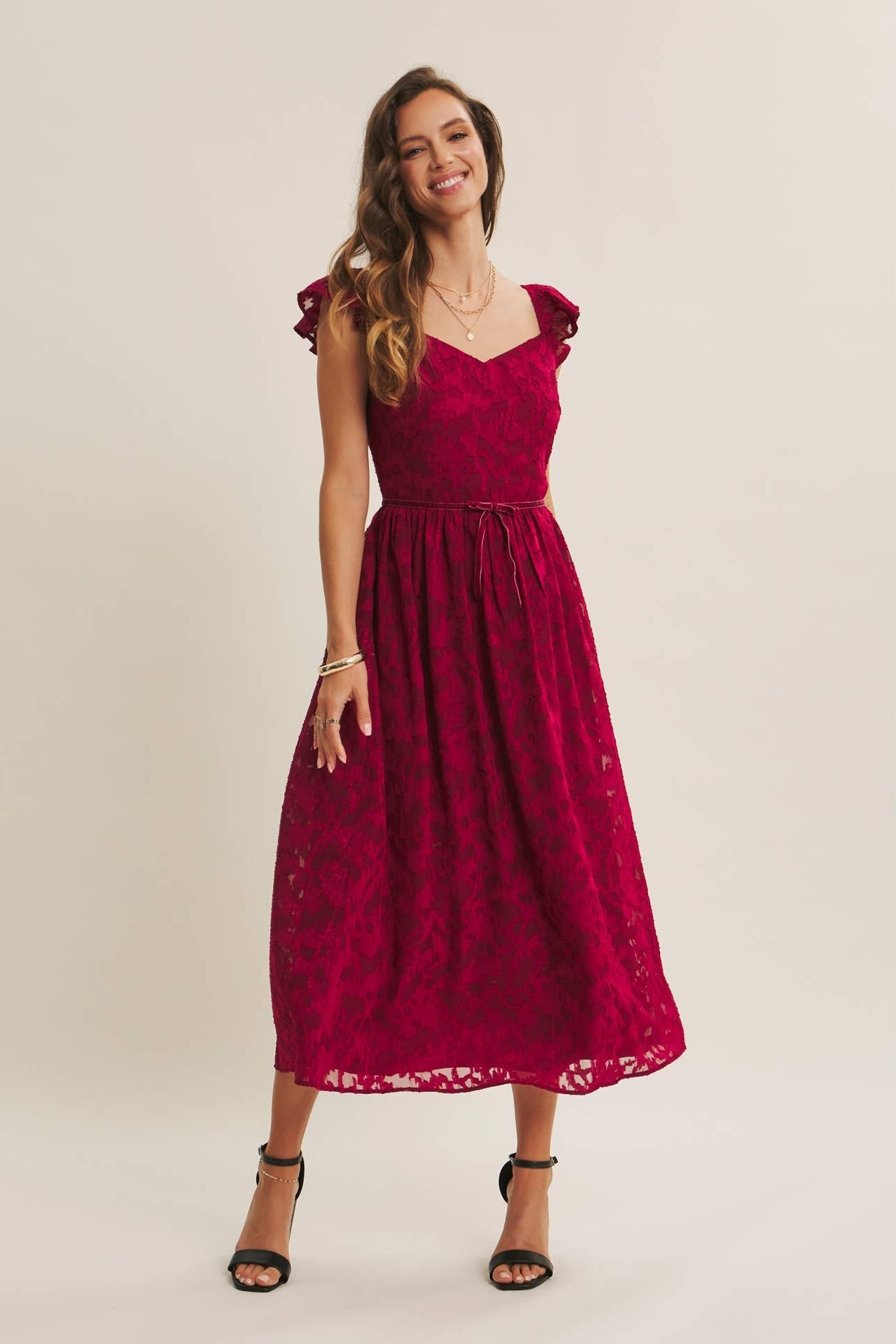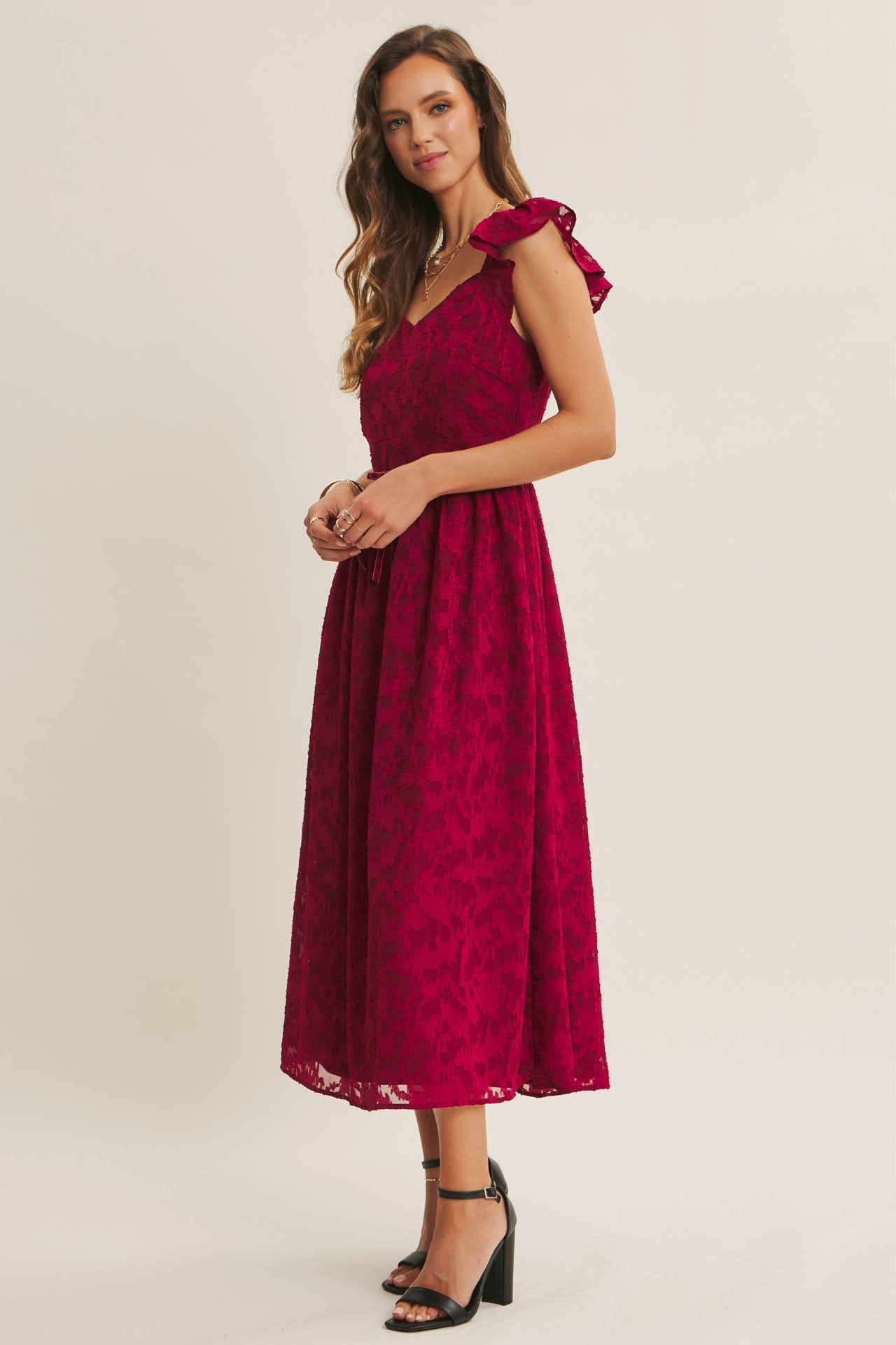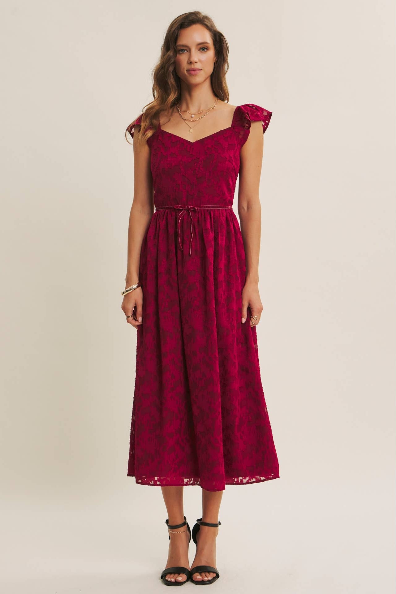This holiday-ready midi dress is crafted in intricate jacquard with a delicate velvet waist tie. The deep hue captures a timeless elegance, perfect for winter weddings, seasonal soirées, or candlelit dinners.