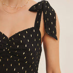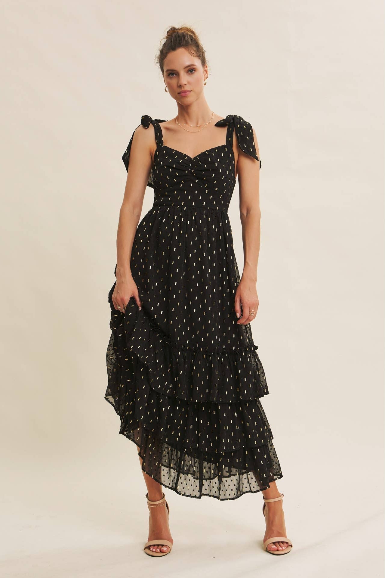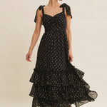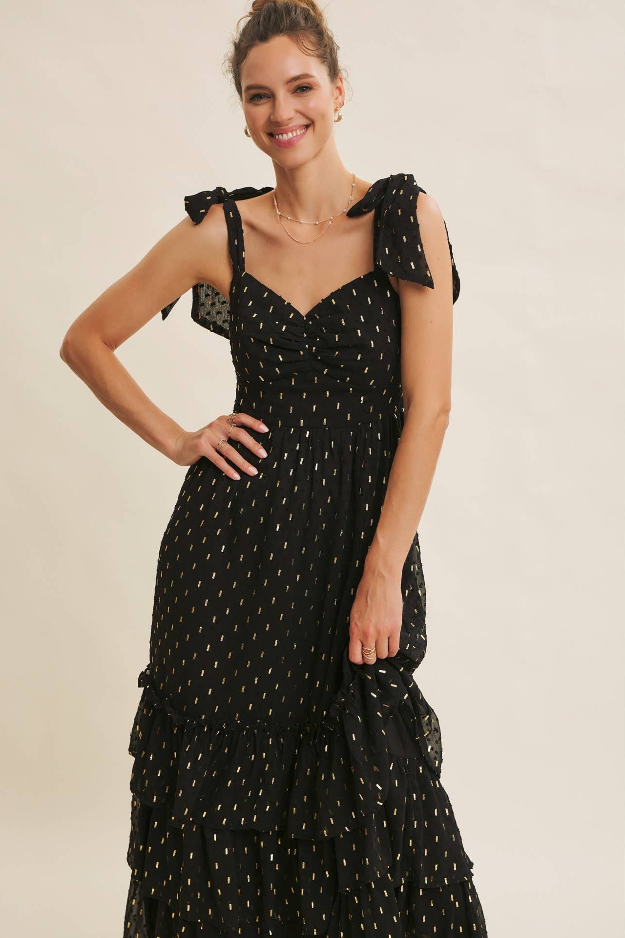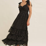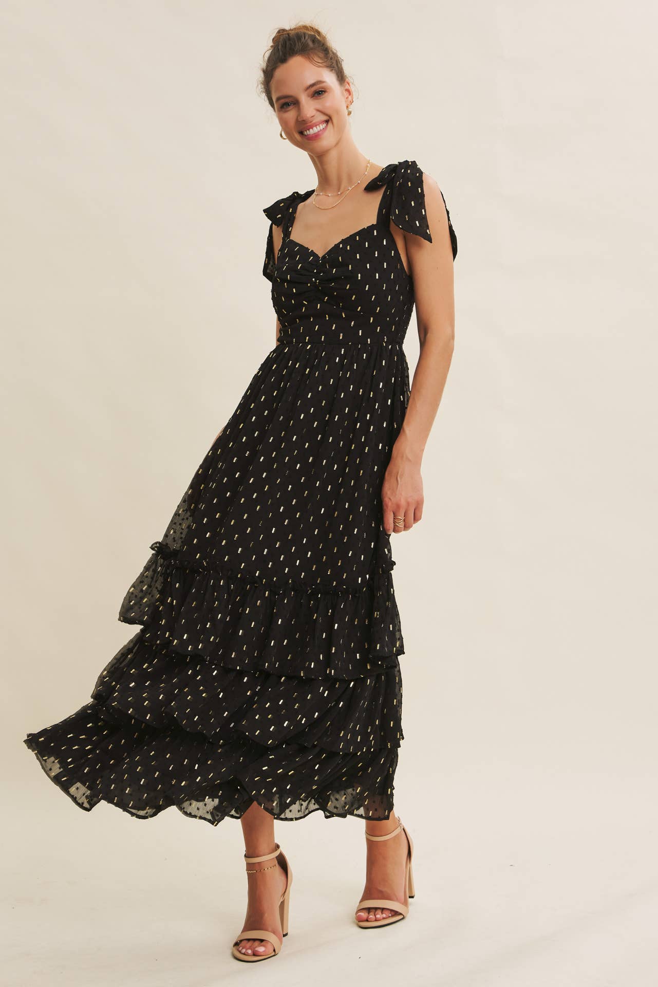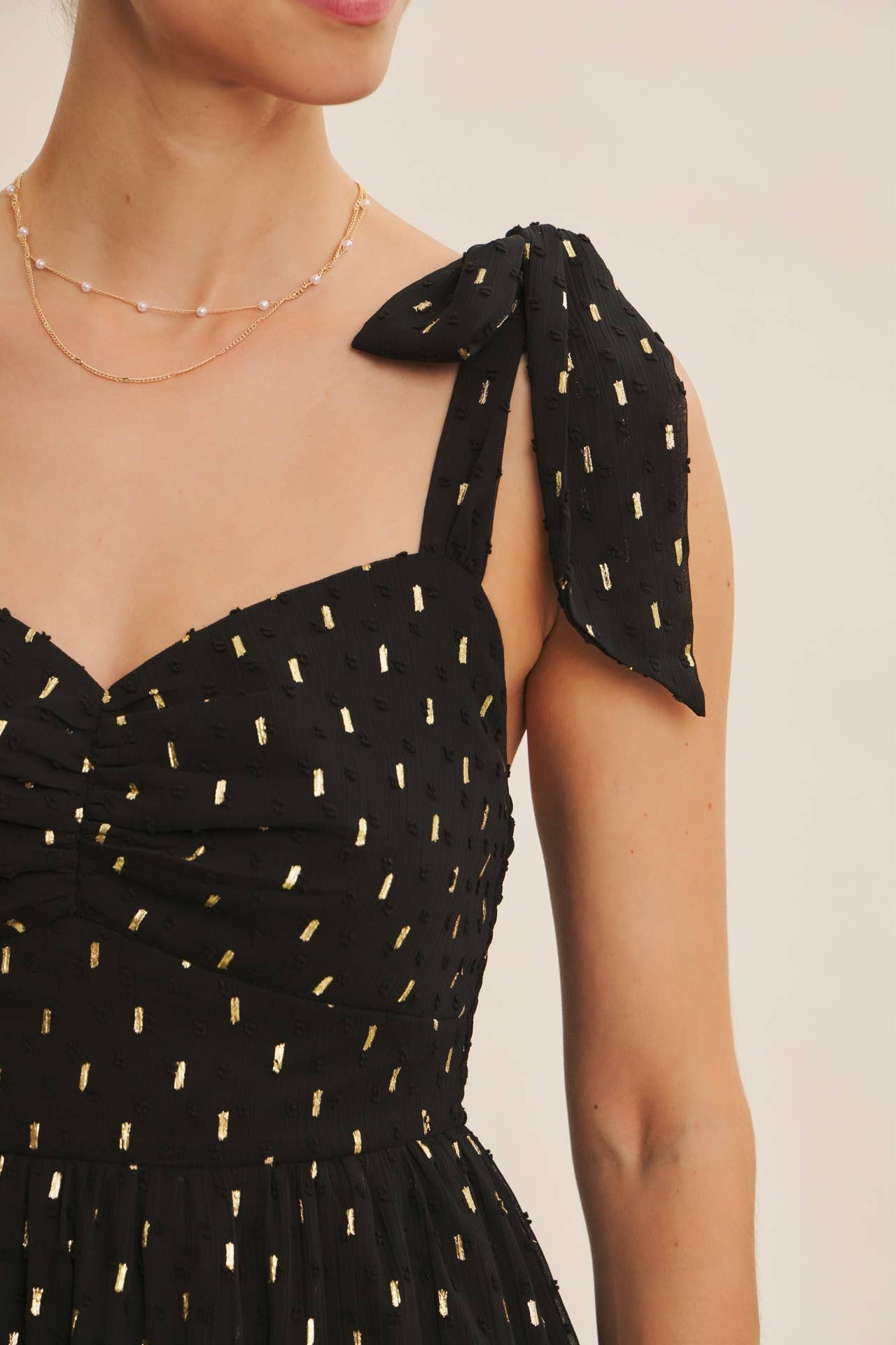 Designed for the season’s most magical moments, this black and gold stunner is made for candlelit parties and festive soirées. Shimmering foil dots twinkle across airy swiss dot chiffon, while ruched details and self-tie shoulder straps add a playful, feminine touch. Whether it’s a holiday celebration or formal gathering, this maxi is your go-to for effortless elegance with standout flair.