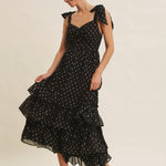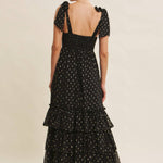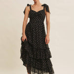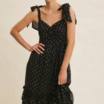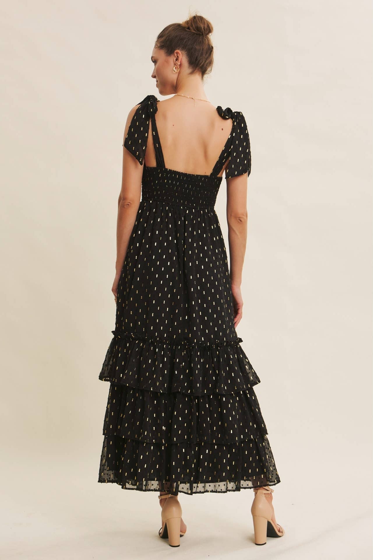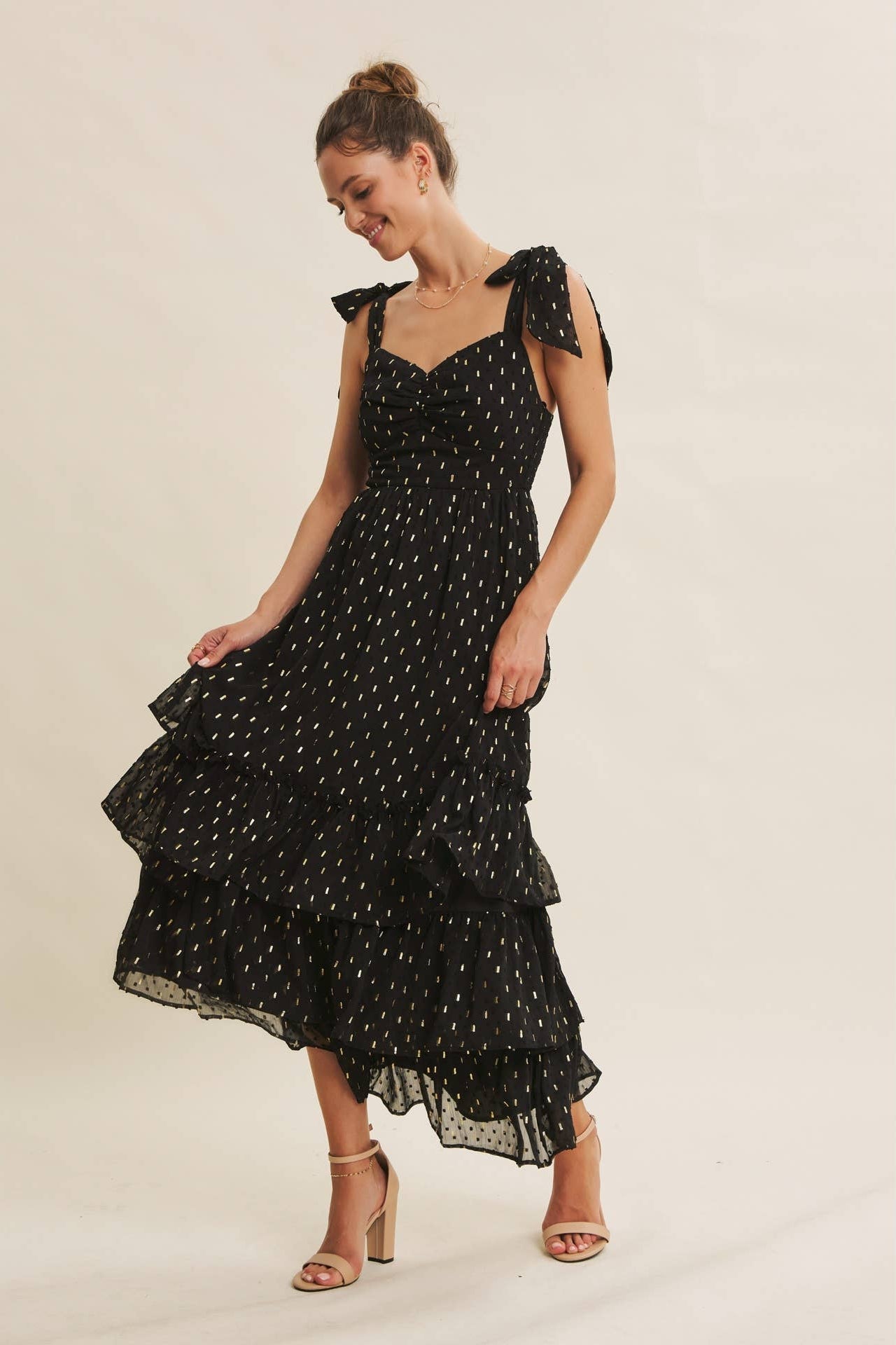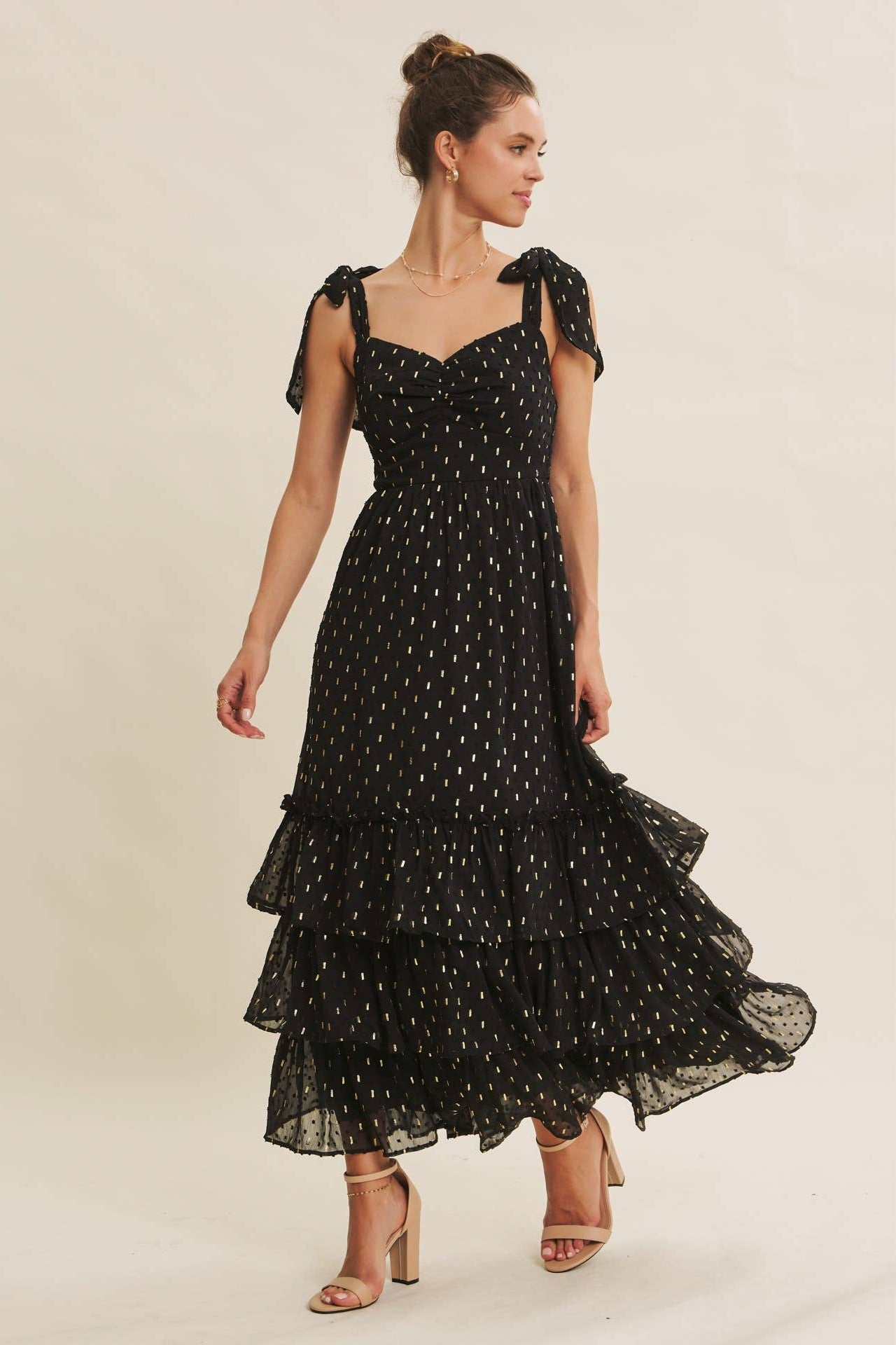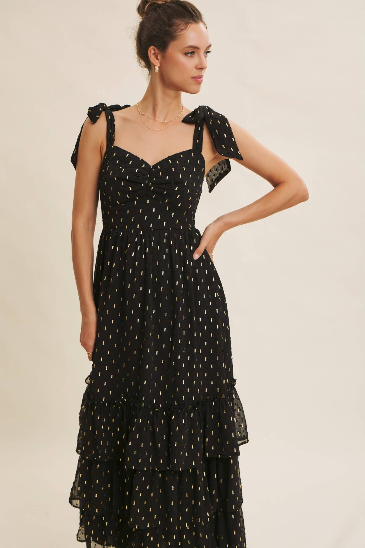 Designed for the season’s most magical moments, this black and gold stunner is made for candlelit parties and festive soirées. Shimmering foil dots twinkle across airy swiss dot chiffon, while ruched details and self-tie shoulder straps add a playful, feminine touch. Whether it’s a holiday celebration or formal gathering, this maxi is your go-to for effortless elegance with standout flair.