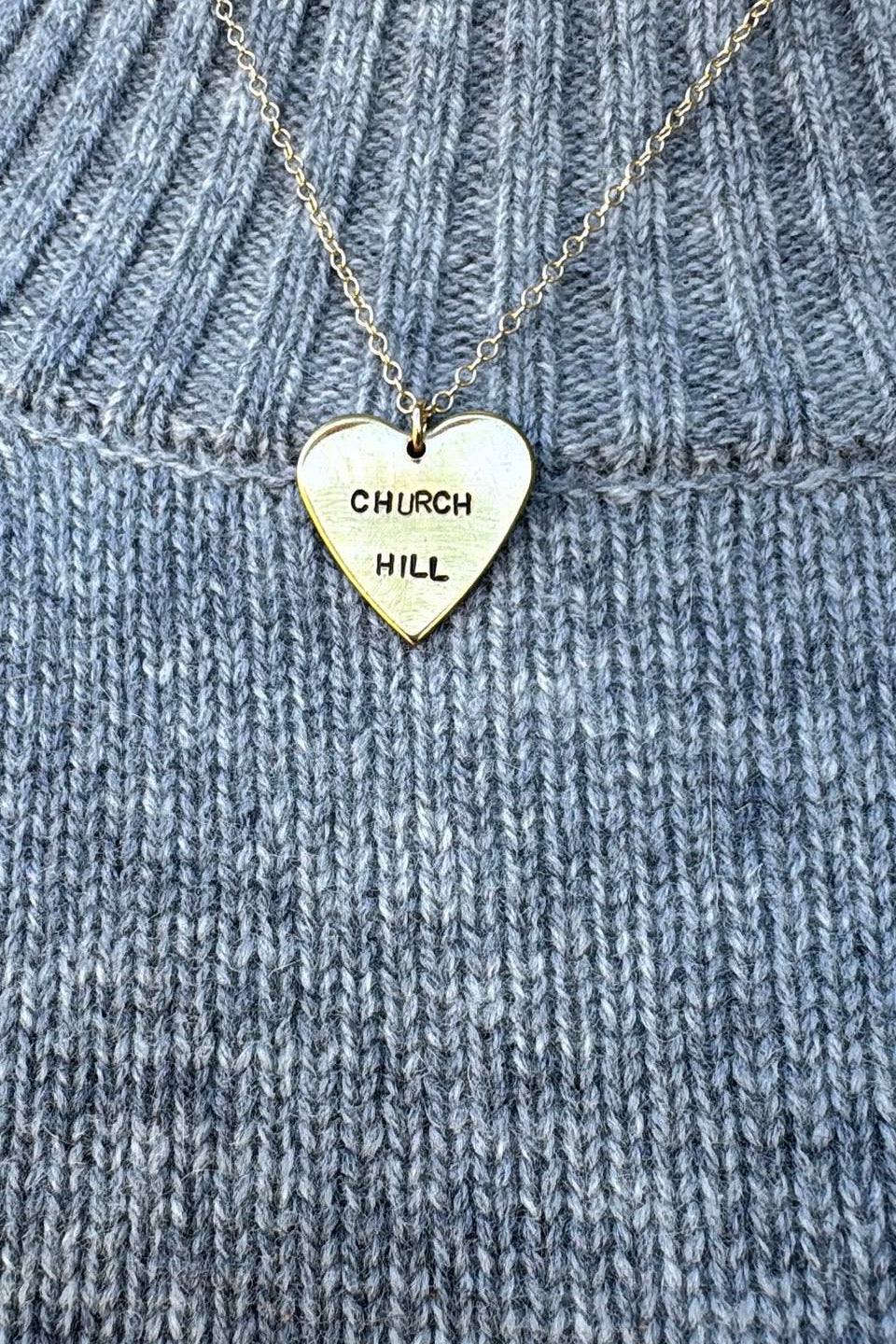 Show your Church Hill pride with this stamped brass heart pendant necklace.