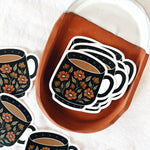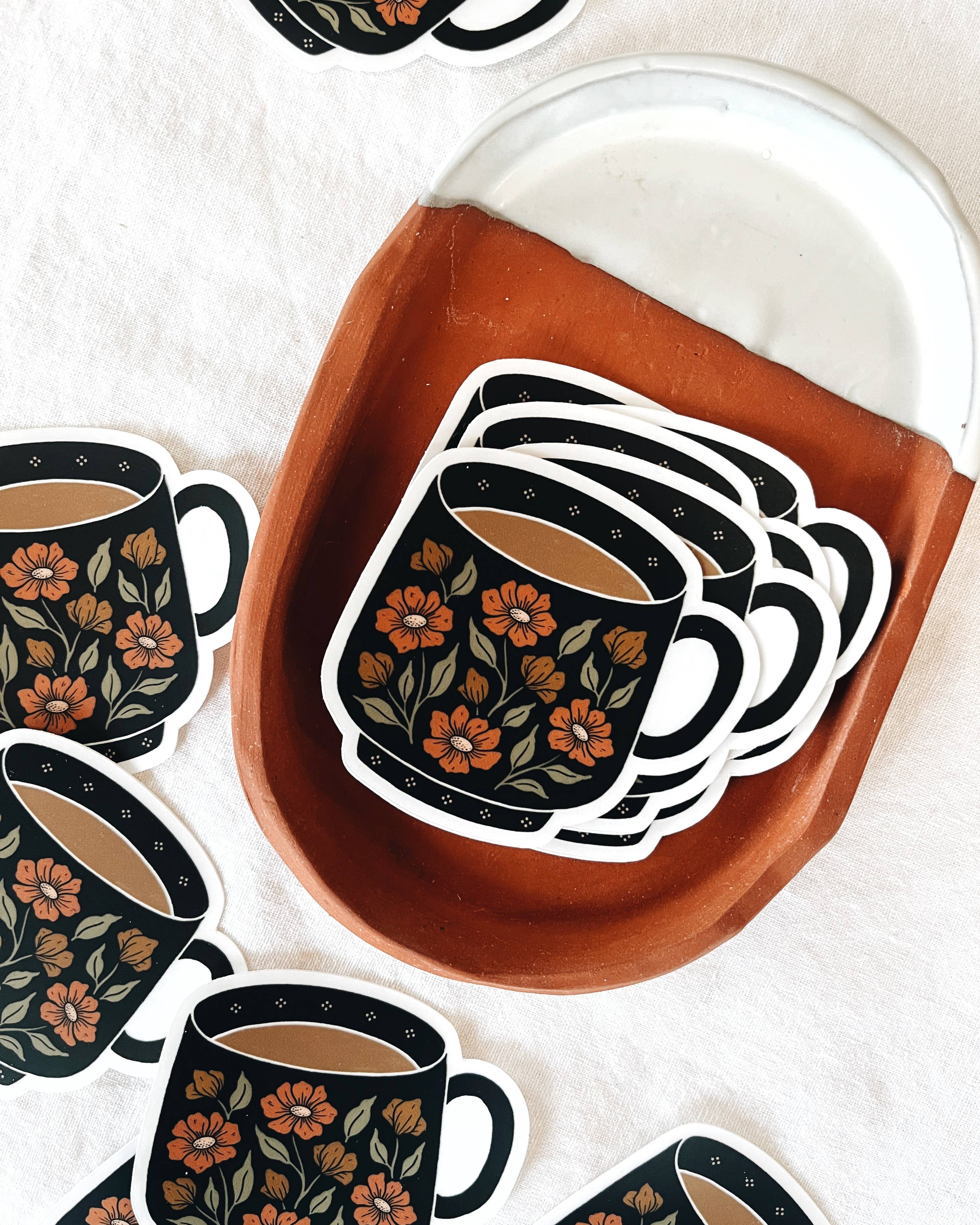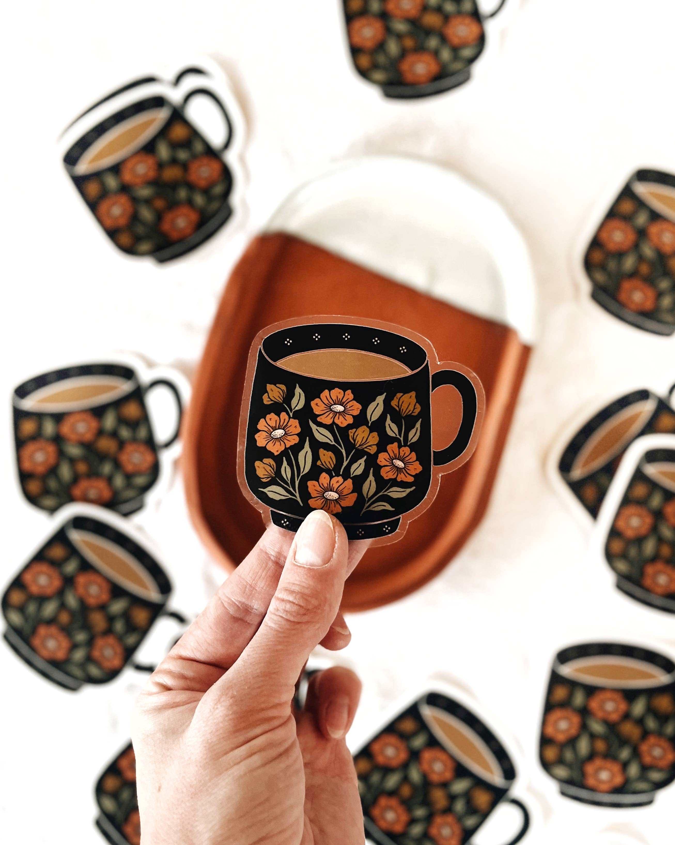 This sticker features a black coffee mug / tea cup with ochre yellow & rust colored florals. The greenery is a sage green. Perfect for anyone who loves a cup of something warm in the morning. The cup is on a clear background, so outside the cup & the outlines of the cup will take the color of whatever background it sits on. This is a high quality, durable vinyl. It is scratch proof, water proof, and weather proof. It can even safely go through the dishwasher. Great to put on laptops, water flasks, your vehicle, & any other place it will get seen and used often.