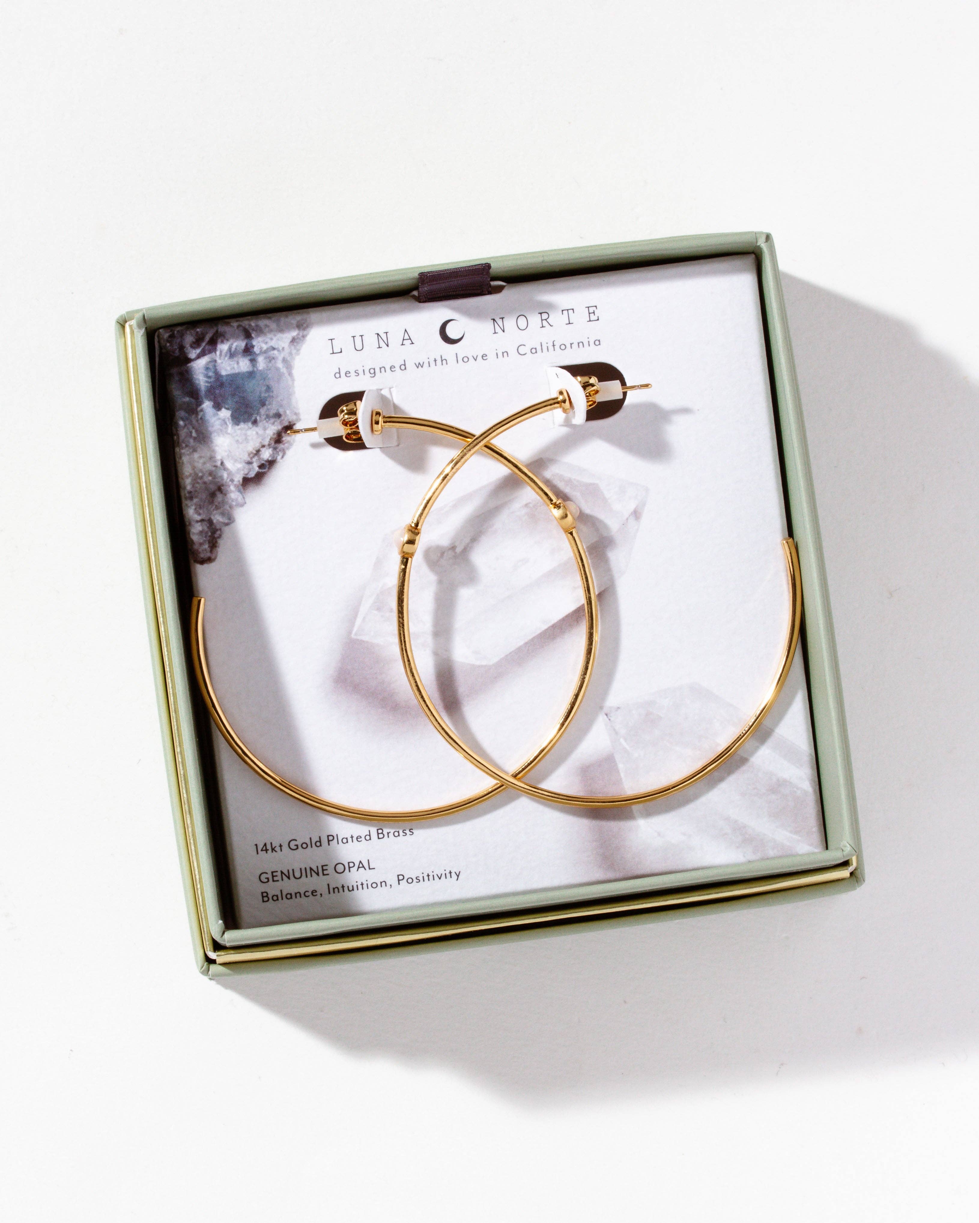 This classic large hoop style features a modern twist: a bezel-set opal stone front and center. Made with 14KT gold plating, each opal catches the light with every turn, creating a mesmerizing play of color. The lightweight design ensures all-day comfort, while the opal adds a touch of ethereal beauty—perfect for anyone seeking a versatile piece that transitions effortlessly from day to night.