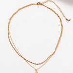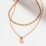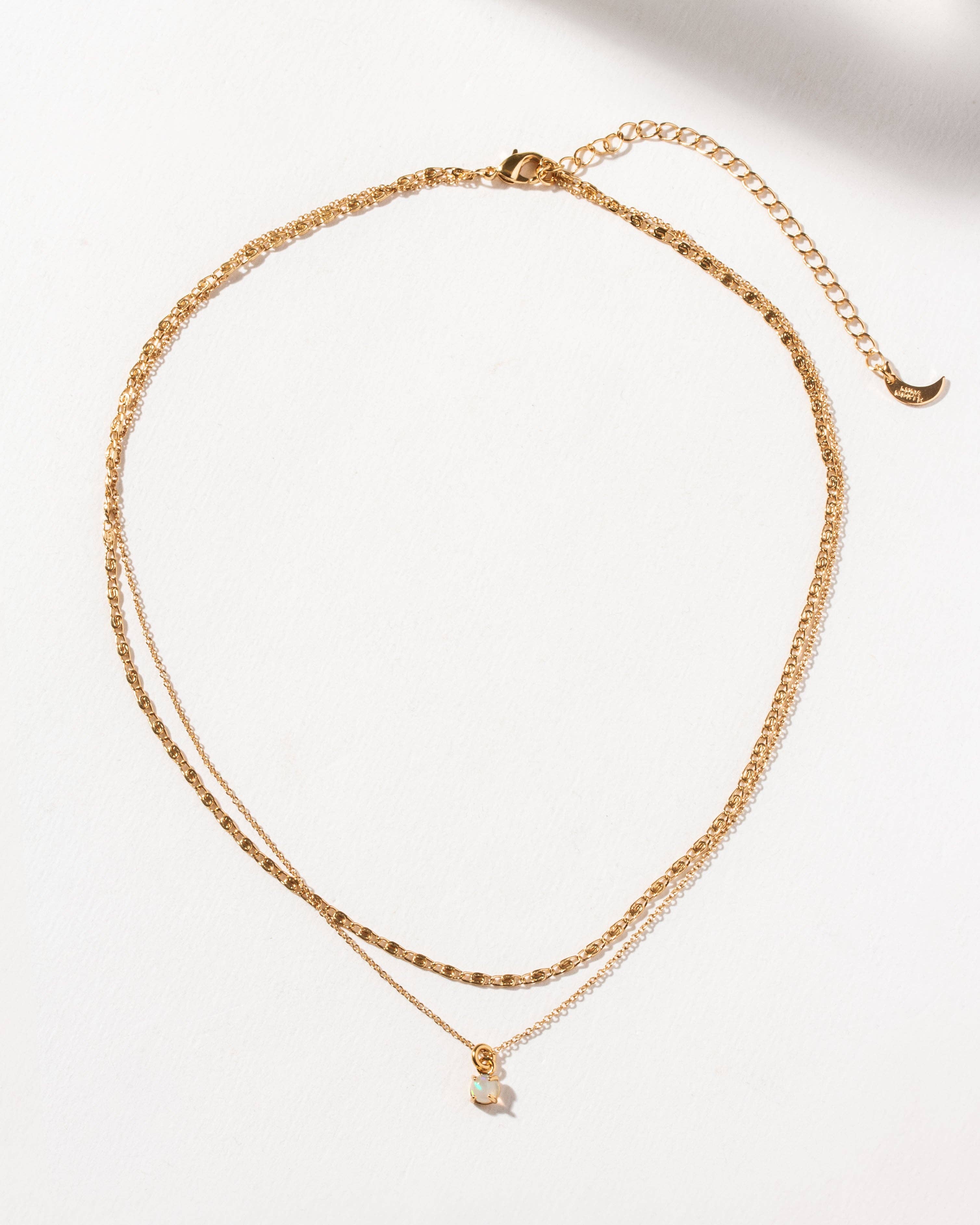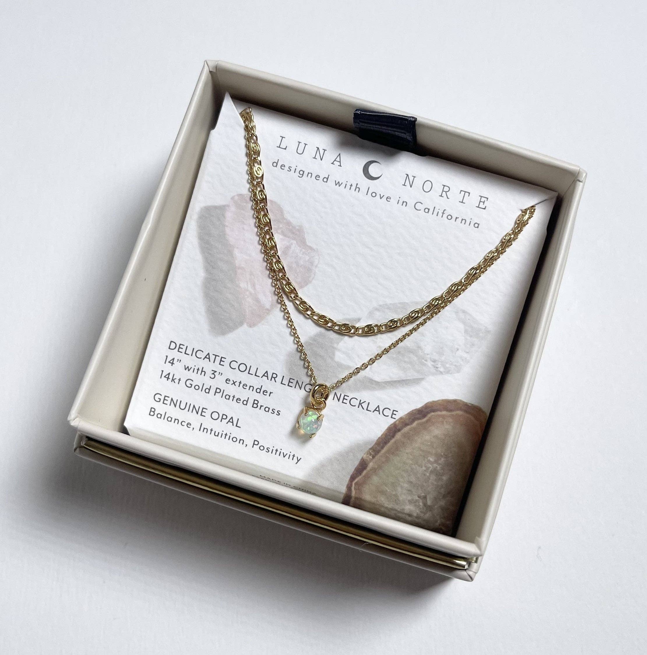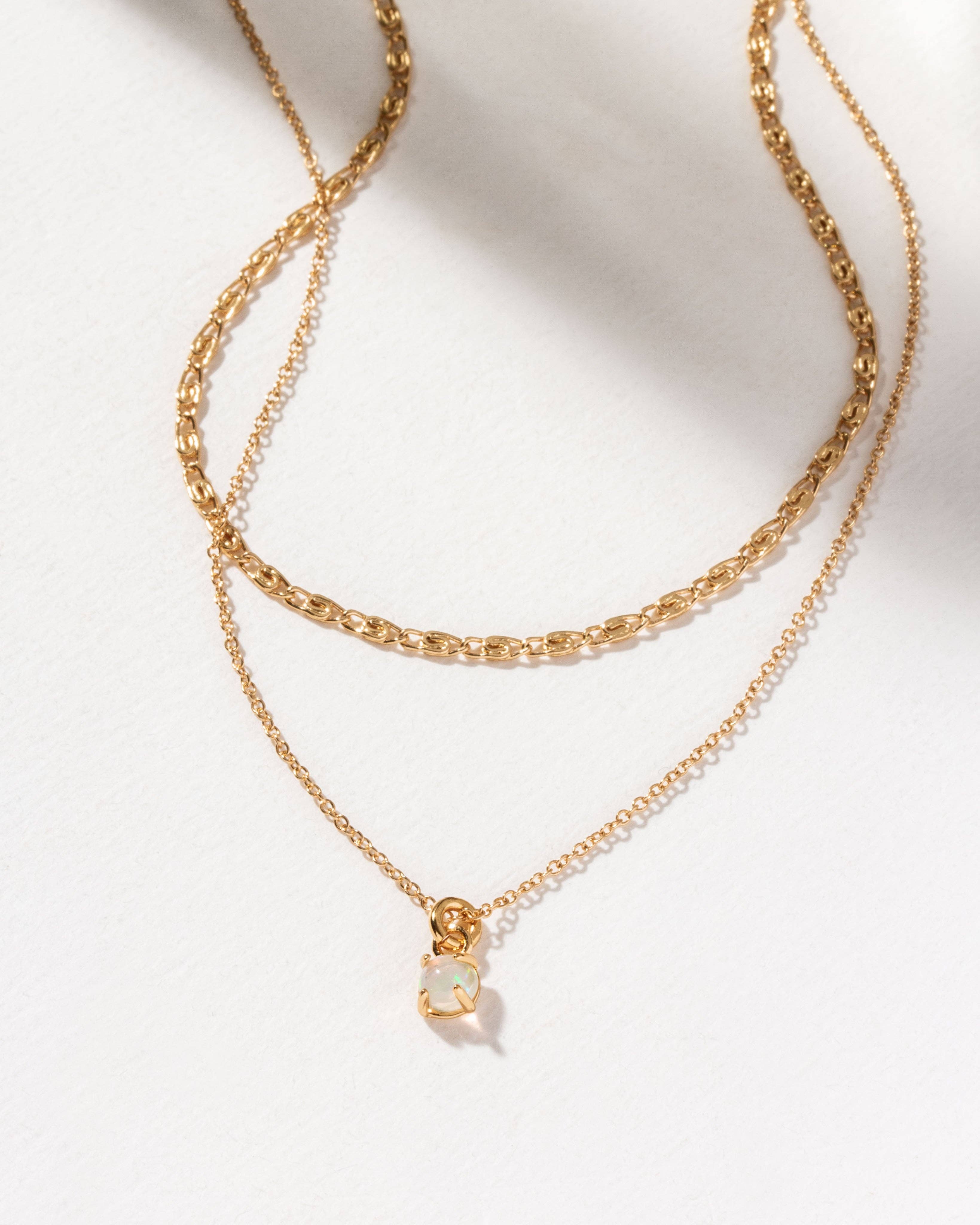 This dual-chained necklace features a dainty chain layered above a simple vine chain adorned with a genuine Opal stone.