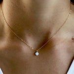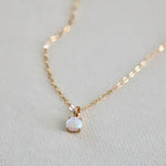 The Opal Drop Necklace features a standard chain length with an opal pendant that can be layered with other pieces or to shine on its own!