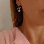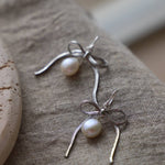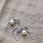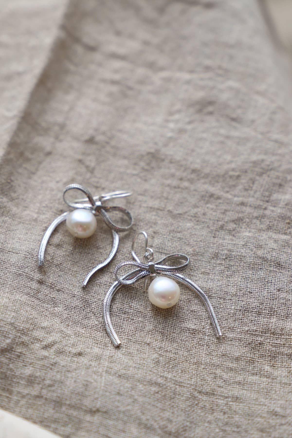 Add a touch of romance to your look with our Sloane Earrings. Featuring a metallic silver bow charm with our hand selected freshwater pearl nugget bead. Each freshwater pearl is naturally unique, showcasing its own subtle variations in shape and luster