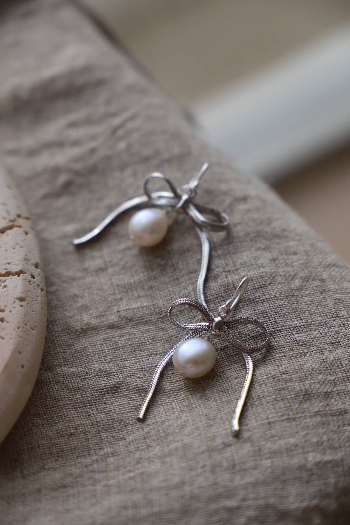 • Materials: Silver french earwire, thin chain bow dangle with charm stone, freshwater pearl