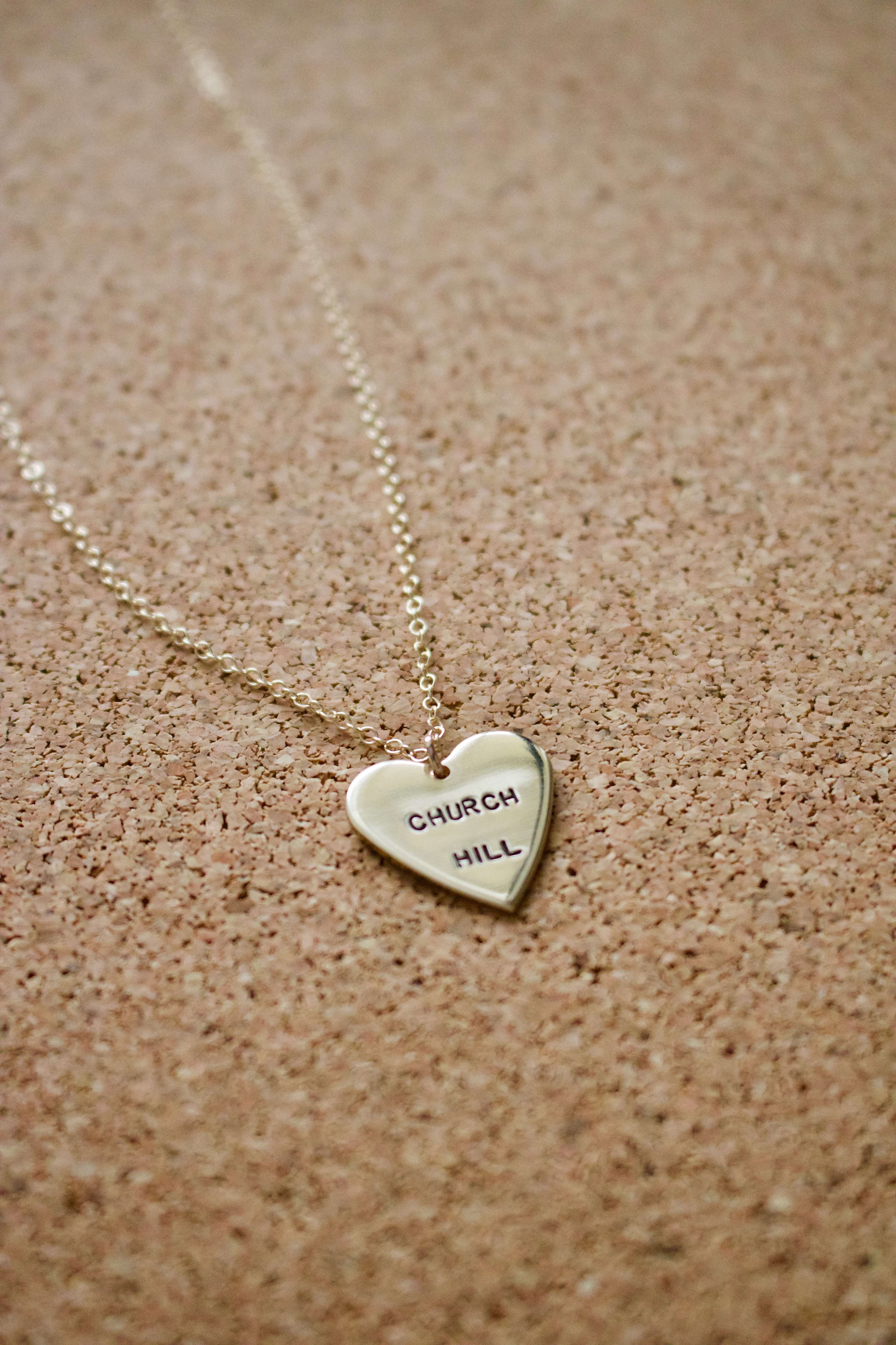 Show your Church Hill pride with this stamped brass heart pendant necklace.