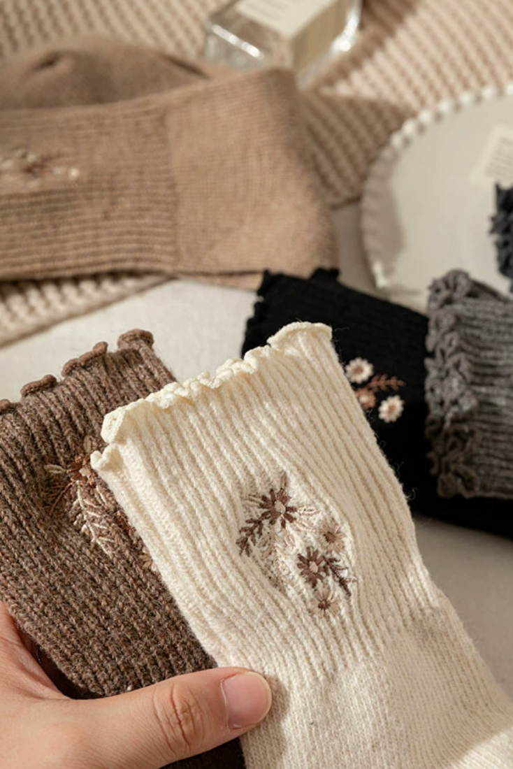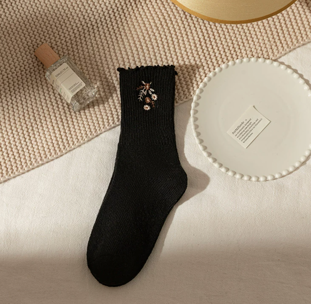 These cute ribbed socks are a warm-and-fuzzy essential for your winter drawer, featuring delicate floral embroidery and a sweet ruffle trim. Soft, stretchy, and effortlessly chic for everyday lounging.