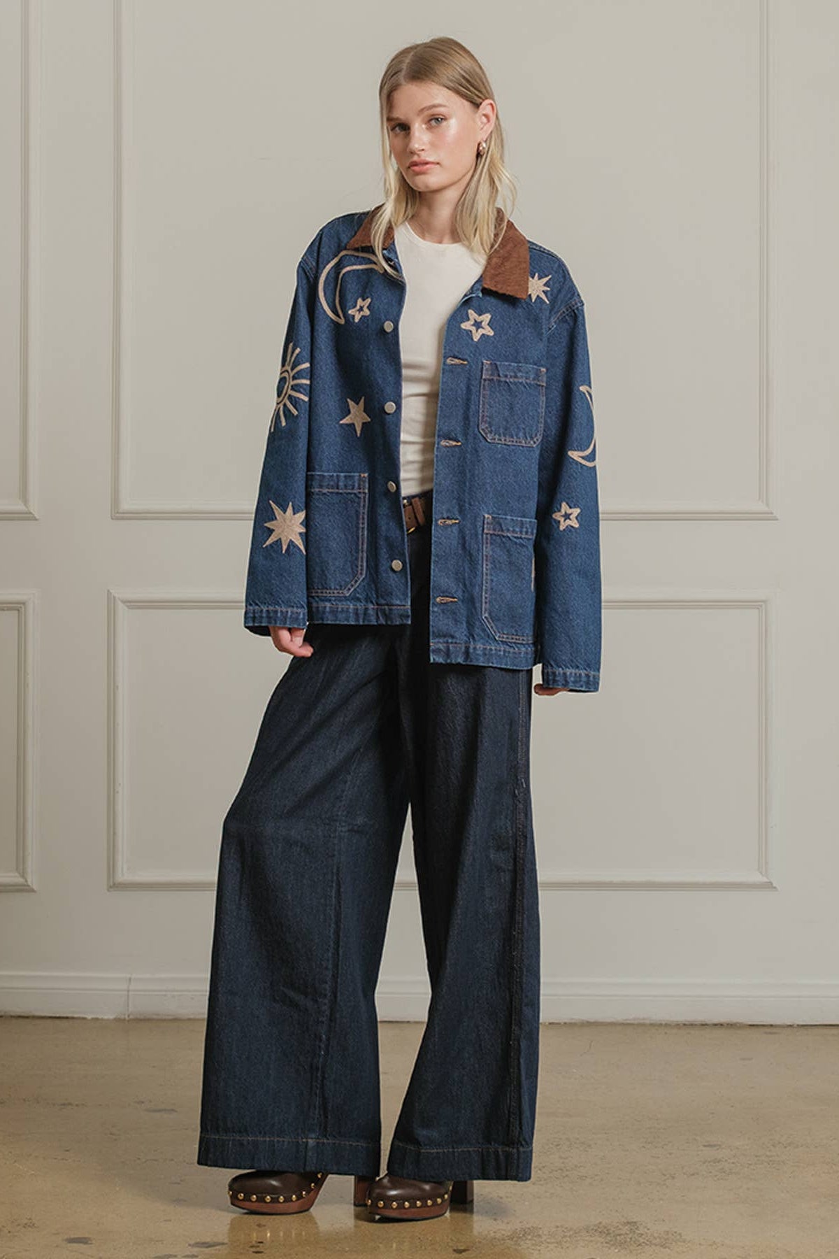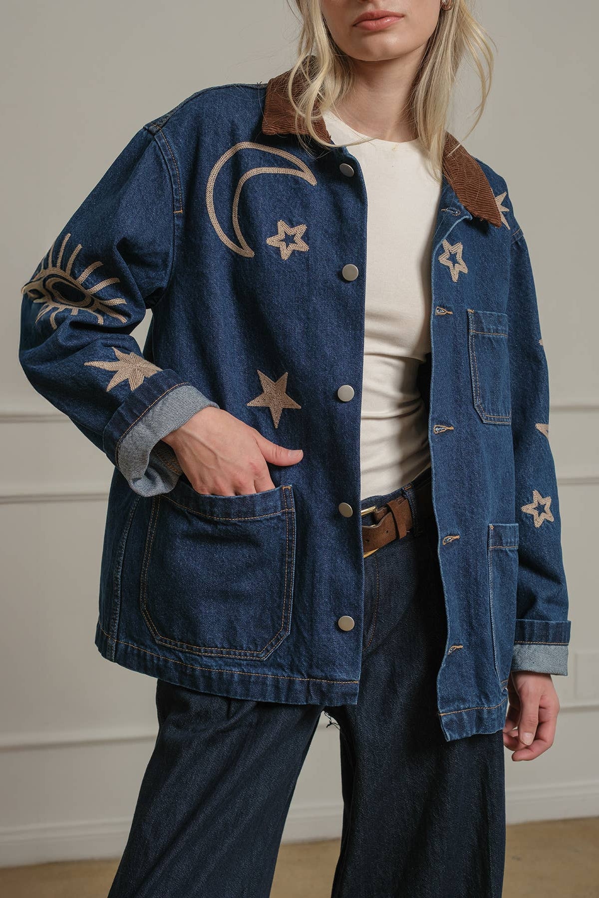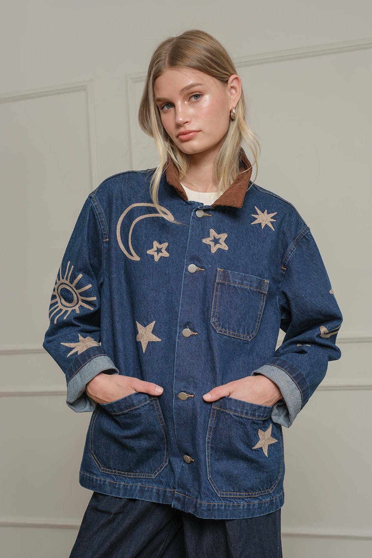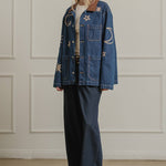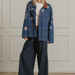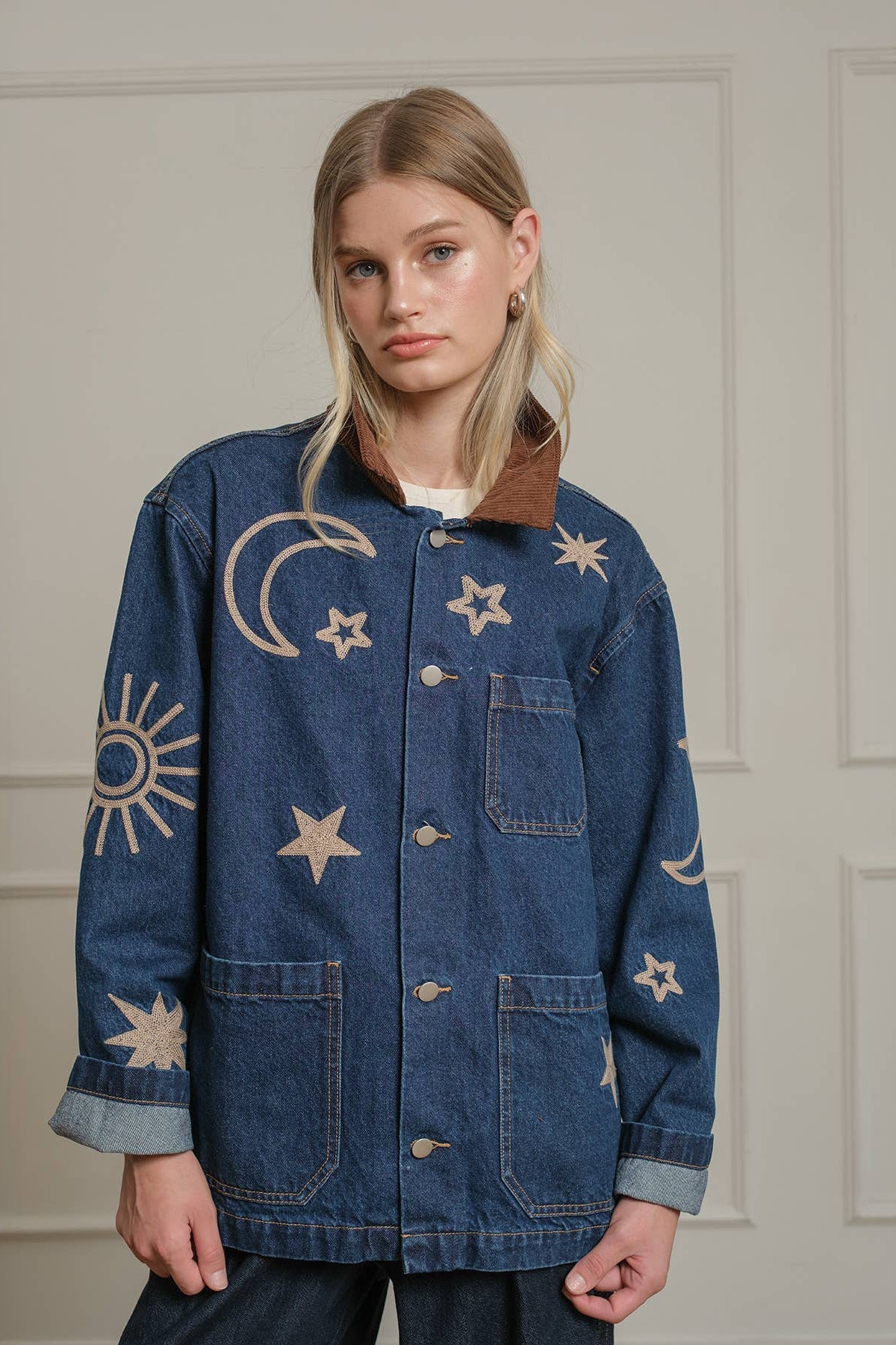 A statement denim jacket featuring celestial-inspired embroidery with stars, moons, and suns. Designed with a relaxed fit and a contrast corduroy collar, this jacket brings a playful yet vintage-inspired vibe to your wardrobe. Functional front pockets and button-down closure make it an easy layering piece for casual, everyday wear. Perfect for adding a touch of cosmic charm to any outfit.