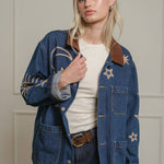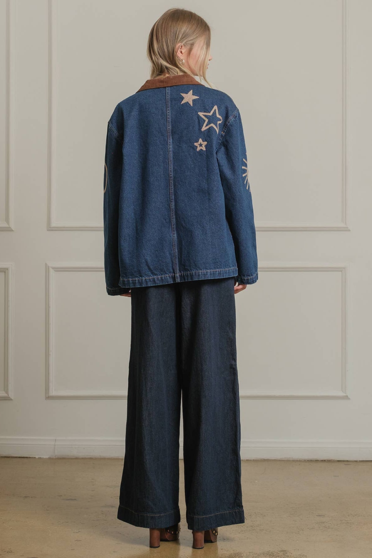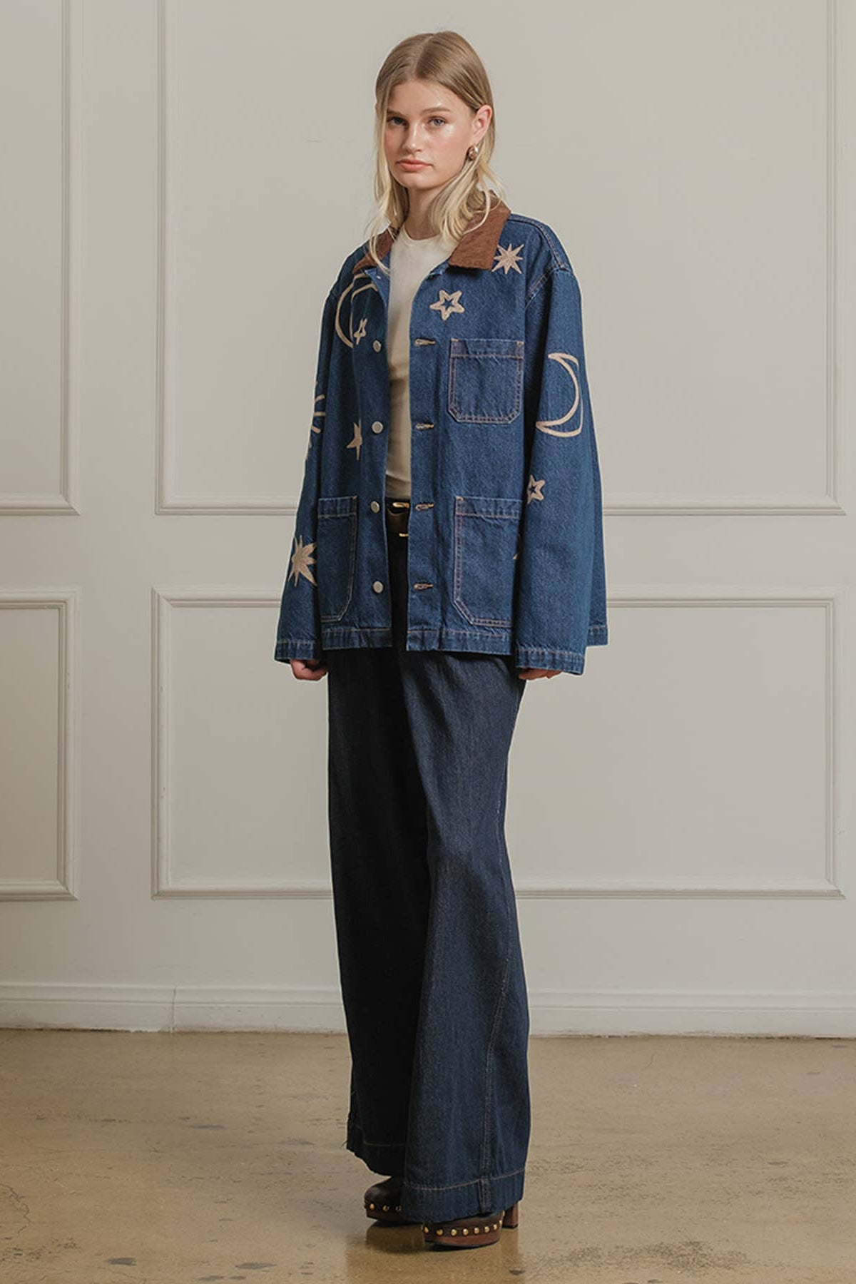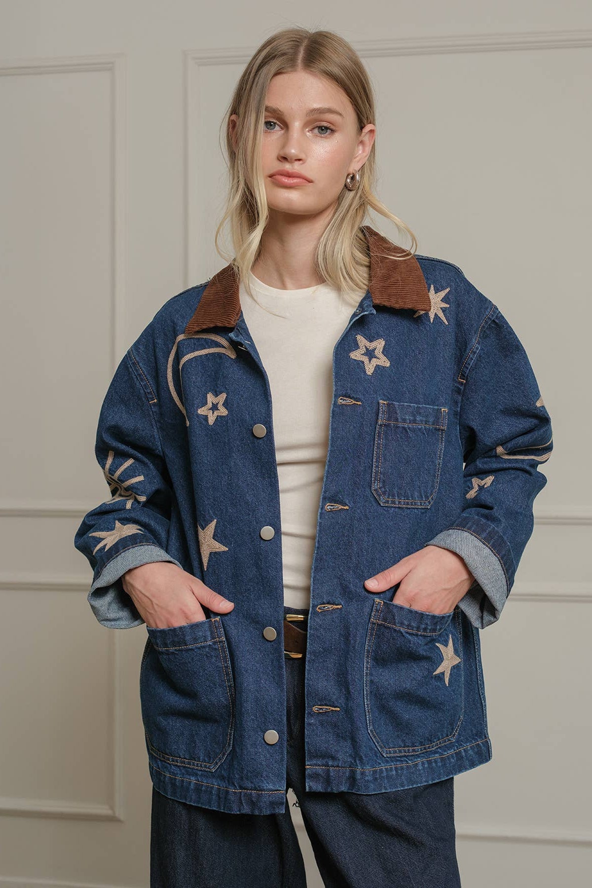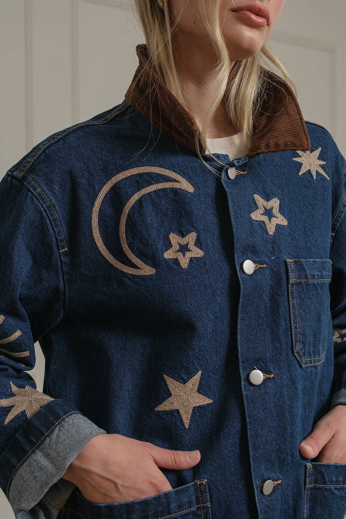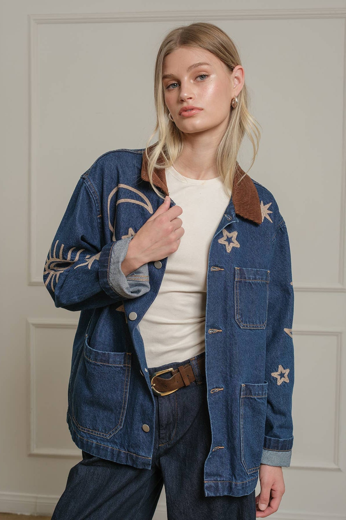 A statement denim jacket featuring celestial-inspired embroidery with stars, moons, and suns. Designed with a relaxed fit and a contrast corduroy collar, this jacket brings a playful yet vintage-inspired vibe to your wardrobe. Functional front pockets and button-down closure make it an easy layering piece for casual, everyday wear. Perfect for adding a touch of cosmic charm to any outfit.