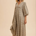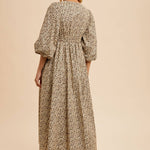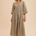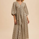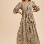 This leopard print maxi features beautiful button front detailing and adorable 3/4 puff sleeves.