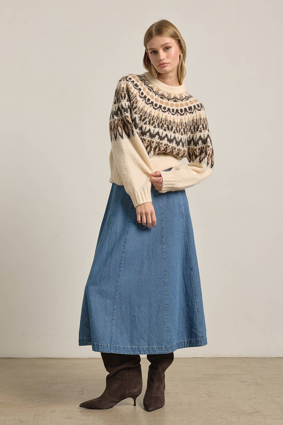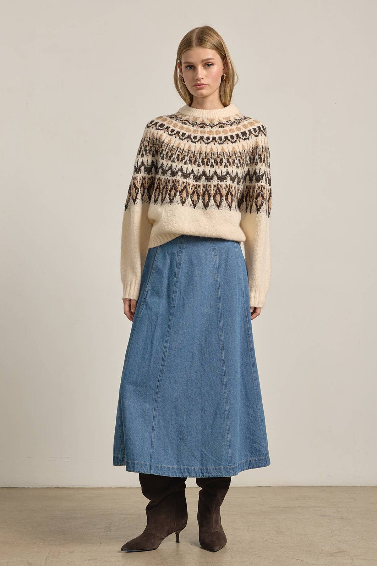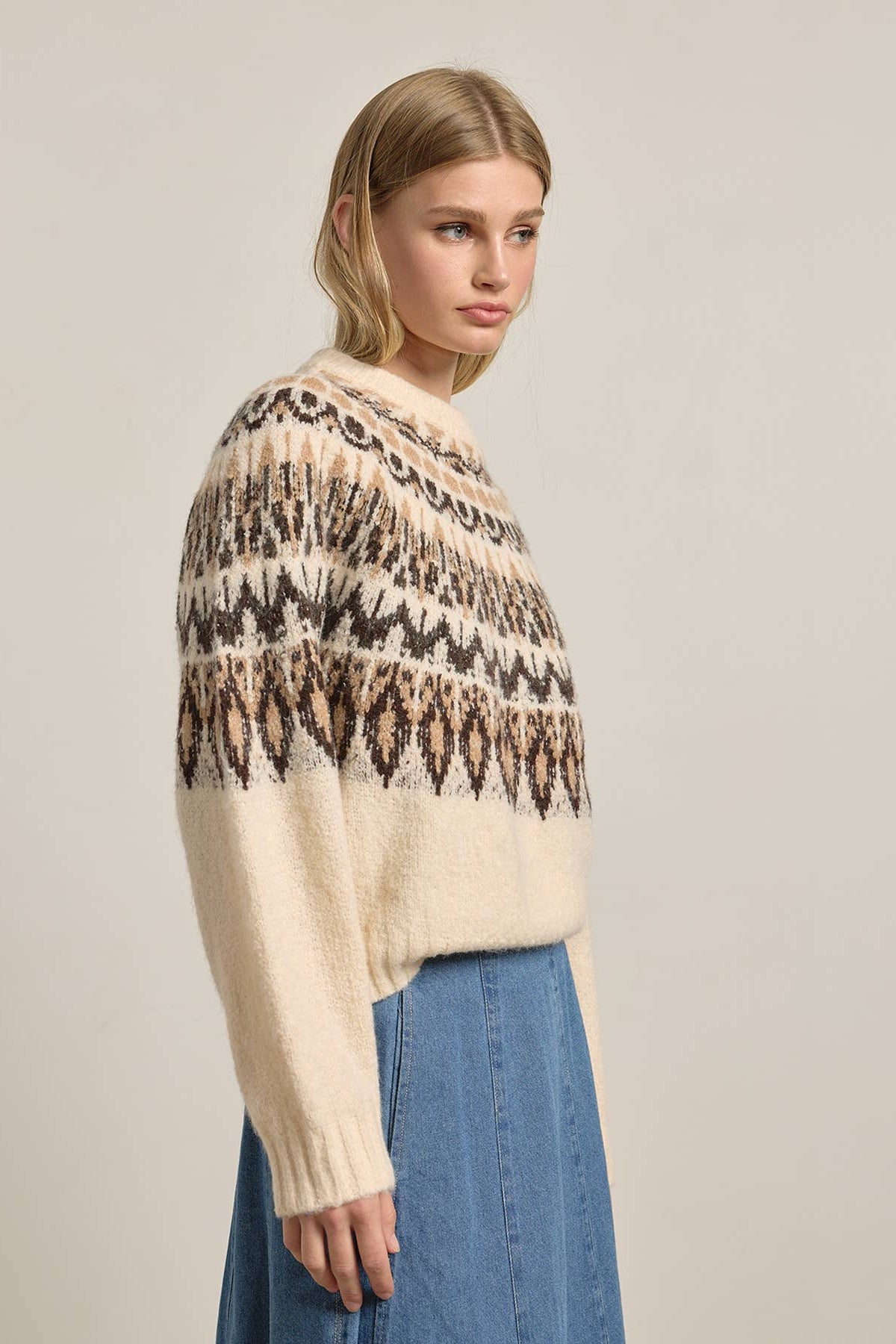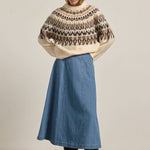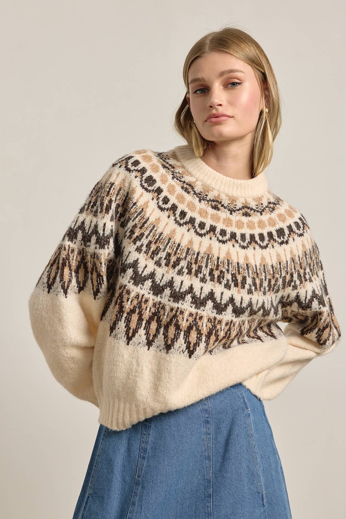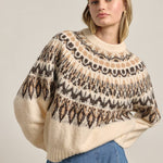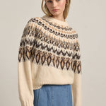 This super soft Nordic-inspired sweater features a rich mix of ivory, black, and beige tones. Pairs well with your favorite slouchy denim to go casual or a satin skirt for a dressier look.