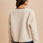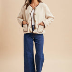 This cozy sherpa jacket features contrast stitch detail and patch pockets.