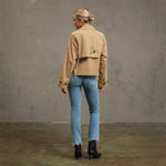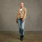 A modern twist on the classic trench — this cropped jacket is crafted from premium cotton twill and elevated with plaid fabric binding along each seam. Features a boxy silhouette, double-breasted front, wide lapels, and cuff details. A refined layering piece perfect for transitional weather.