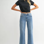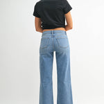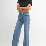 These soft, stretchy jeans feature a slightly wide straight leg, a high rise waist, and a medium wash.