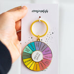 Spin the wheel to decide your fate...or at least, what to eat today. There are so many good foods out there that sometimes it's hard to decide what to go with. I know I am not the only one with this problem, but I have this pin to help me out. Korean? Chinese? Thai? Leftovers? Or just ask Mom? Just flick the spinner and let fate tell you what to eat! An interactive keychain to add flair to your collar, jacket, or bag. Perfect for collecting, displaying, or gifting to a friend! The keychain is made with hard enamel and polished gold-colored metal plating, with an extra sturdy connector ring.