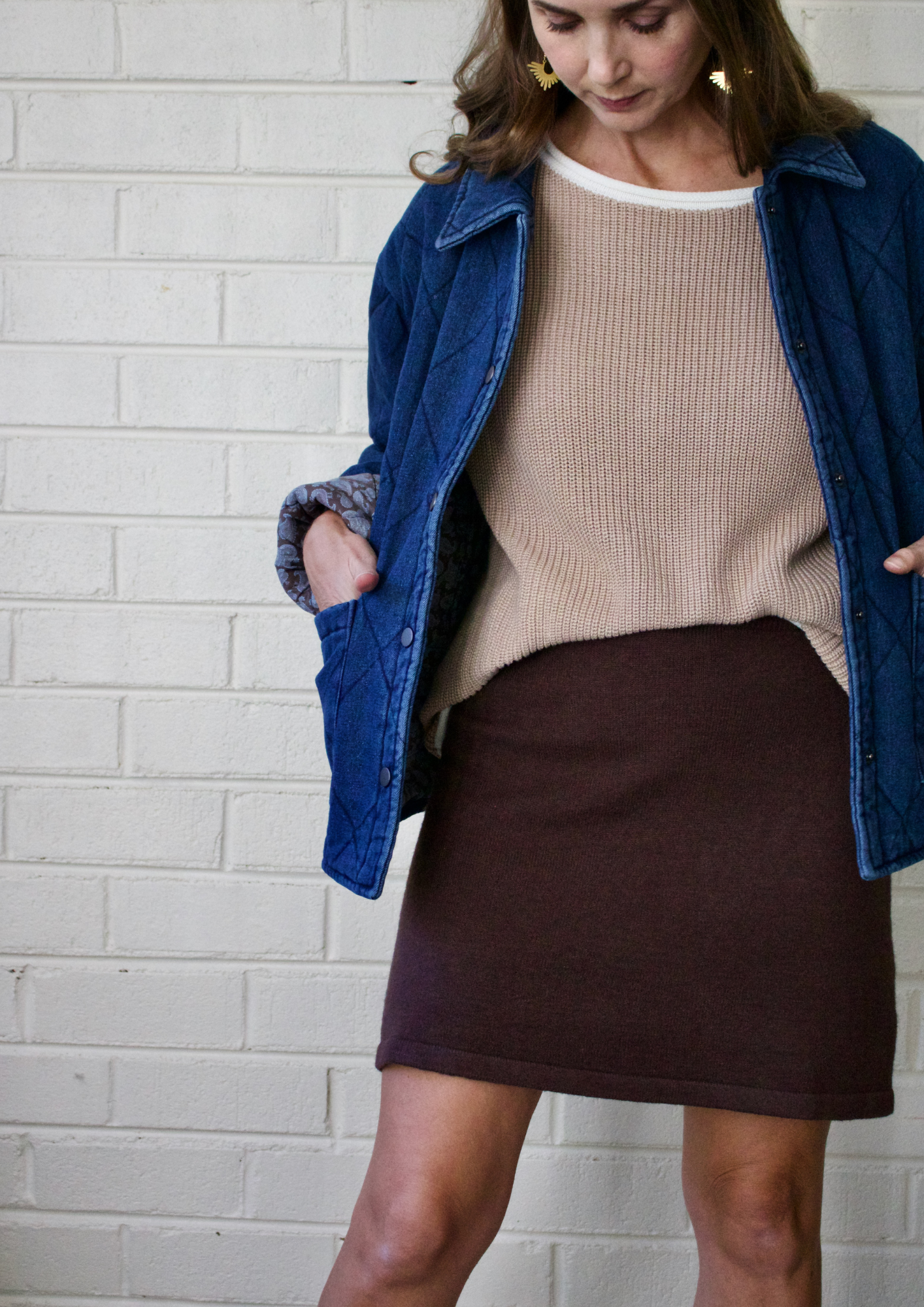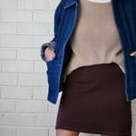 This cozy, sweater knit mini comes in our favorite neutral of the season: chocolate brown. We love it paired with a chore jacket, buttondown, or sweet little cardigan.