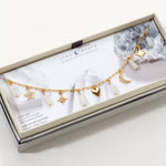 Embrace celestial elegance with this timeless charm necklace. Featuring genuine moonstone drops and a curated selection of gold celestial and heart charms, this piece radiates dreamy, ethereal beauty. Each moonstone tube bead shimmers with subtle flashes of iridescence, evoking the magic of moonlight. This necklace is perfect for layering with other pieces or wearing solo as a standout accessory.