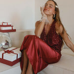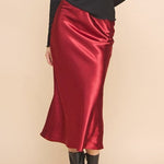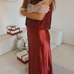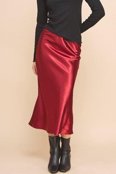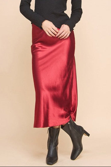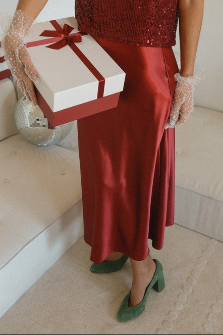This burgundy slip skirt is perfectly paired with your coziest sweater for an elegant high-low look.