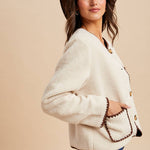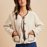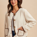 This cozy sherpa jacket features contrast stitch detail and patch pockets.