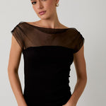 This simple but stunning top features a fitted silhouette with a draped mesh overlay. Pair it with denim for a more casual look or a leather mini skirt for an edgier one.