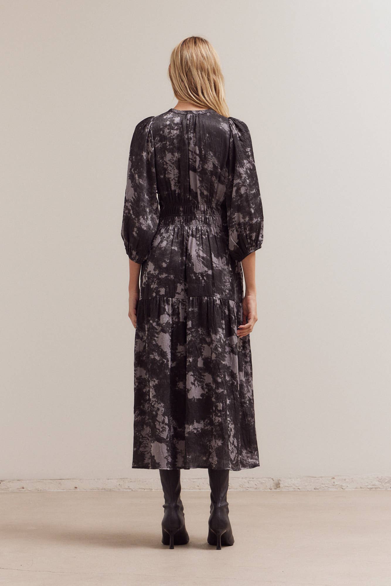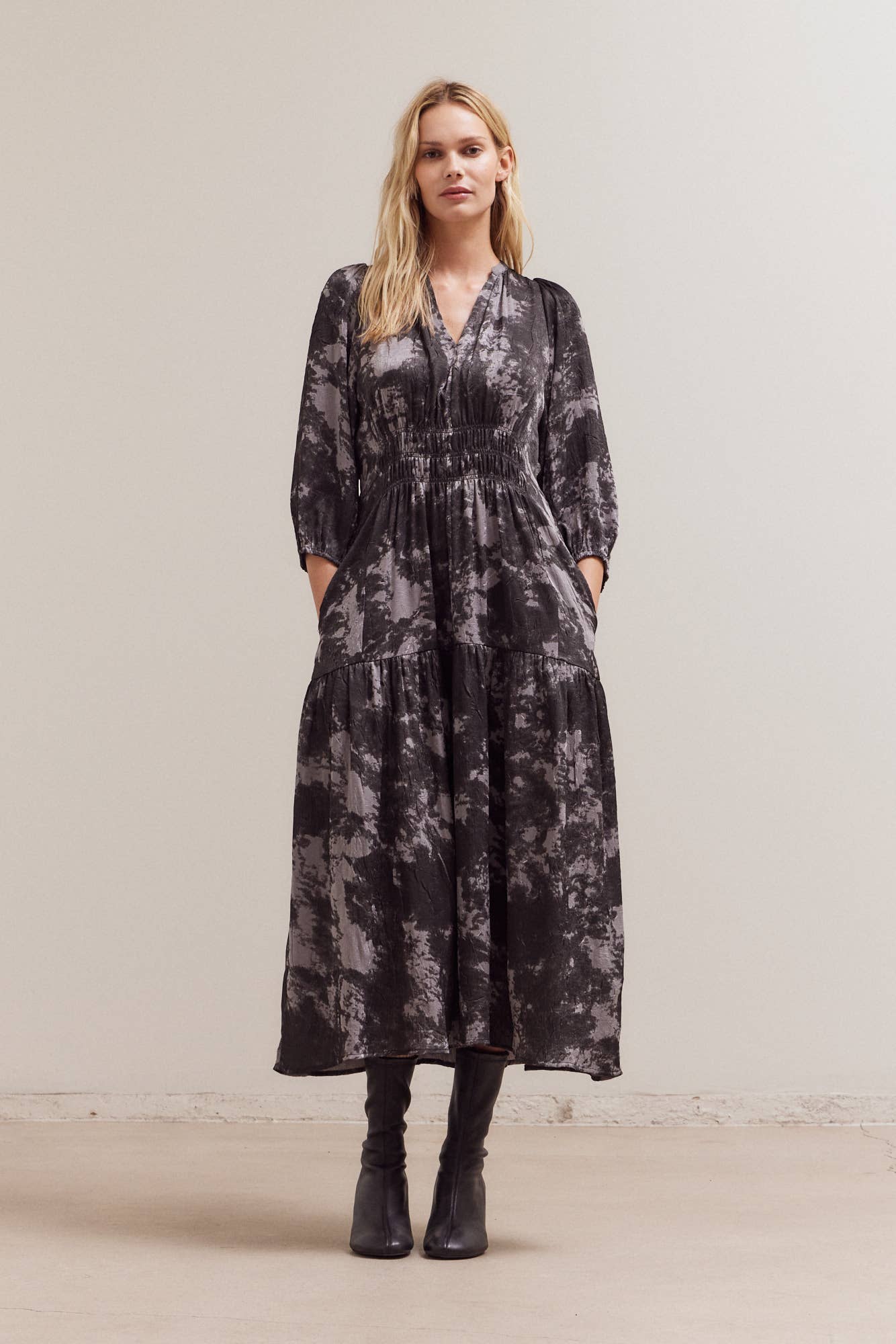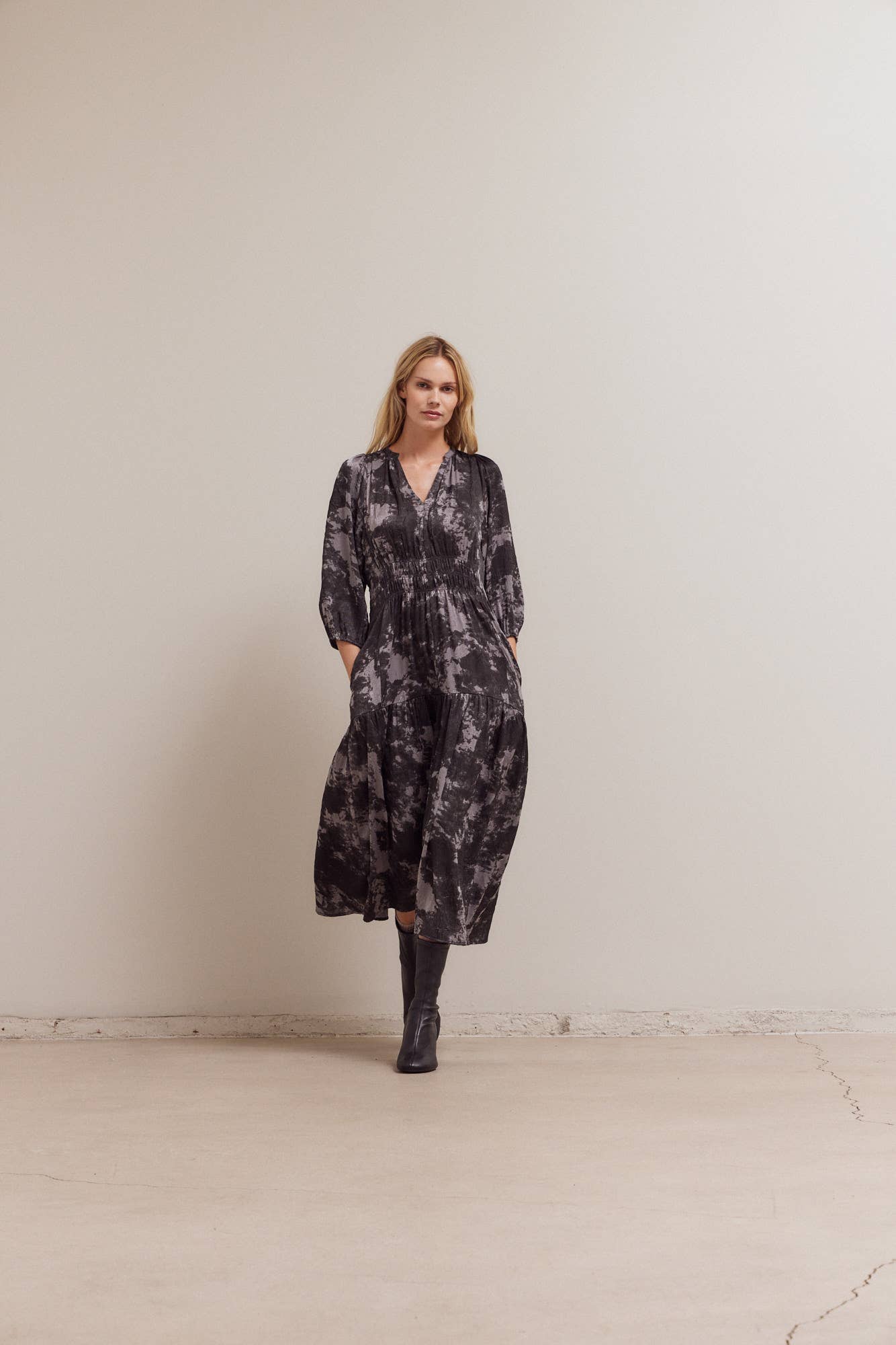 This silky midi is the perfect transitional dress. We love it paired with a chunky cardigan and knee high boots in cooler weather.