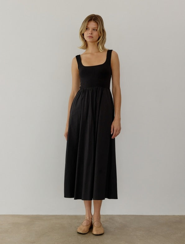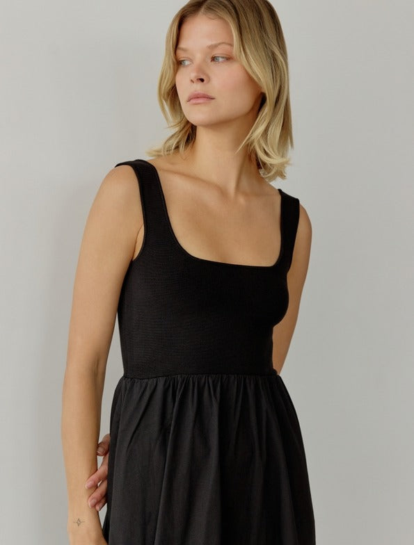 This versatile maxi in a classic silhouette features a knit square neckline top and a woven full skirt.