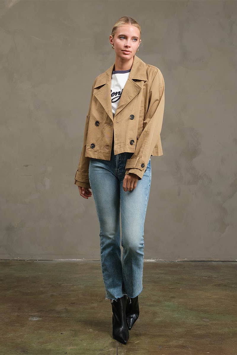 A modern twist on the classic trench — this cropped jacket is crafted from premium cotton twill and elevated with plaid fabric binding along each seam. Features a boxy silhouette, double-breasted front, wide lapels, and cuff details. A refined layering piece perfect for transitional weather.