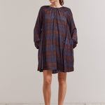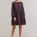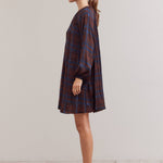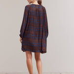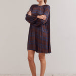 This silky mini dress features pleated ikat plaid fabric and a relaxed, trapeze fit.