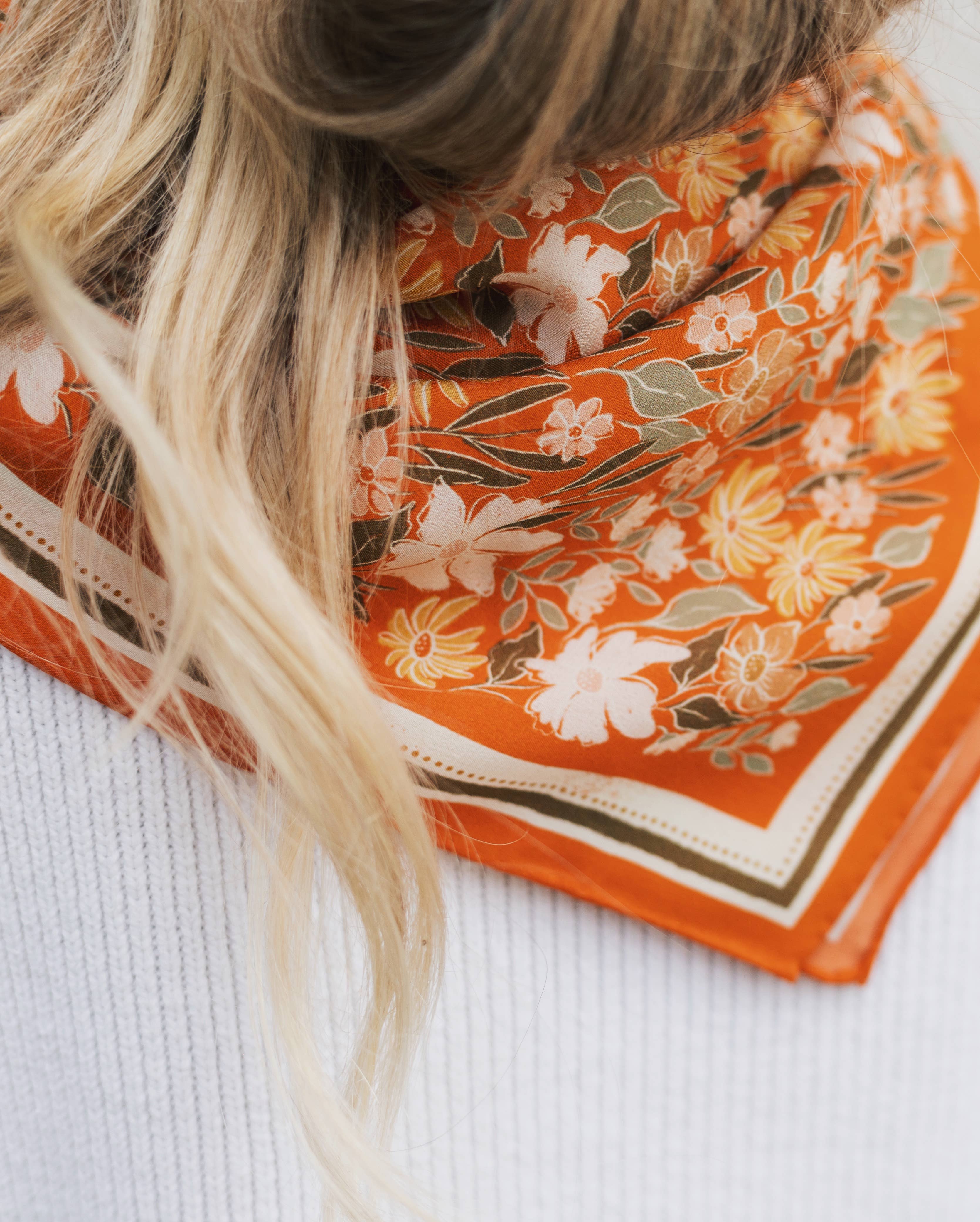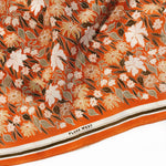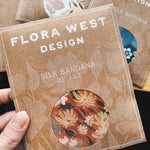 Add extra elegance to any outfit with a lush, 100% silk bandana. Our silks have a luxurious crepe texture, and become beautifully buttery overtime with wear. These silks are created from hand illustrated Flora West designs. Botanical Garden is a colorful floral pattern that pops on its bright orange background (slightly lighter than the last run!). The design is digitally printed onto the silk, and finished off with an invisible hand rolled edge seam. Silks measure 23”x23”. This is slightly larger than a standard adult sized bandana at 22”. Folded diagonally, these scarves are large enough to be worn tied around the neck or worn comfortably around the head as a headband.